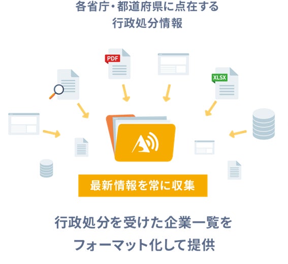 当社が提供する「アラームボックス 行政処分データ」は、省庁・地方自治体を網羅した最新の行政処分情報が毎週自動で届くサービスです。アラームボックスが毎日100箇所以上の行政のウェブページから情報を取得・整理して提供するため、利用会員は行政処分を受けた企業の情報を自社のデータベースを簡単に貯蓄することが可能になります。