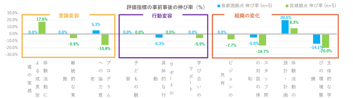 ・実施した2拠点ともに、子どもたちの自主性や創造性を育む「体験活動の設計・計画をする能力」は、