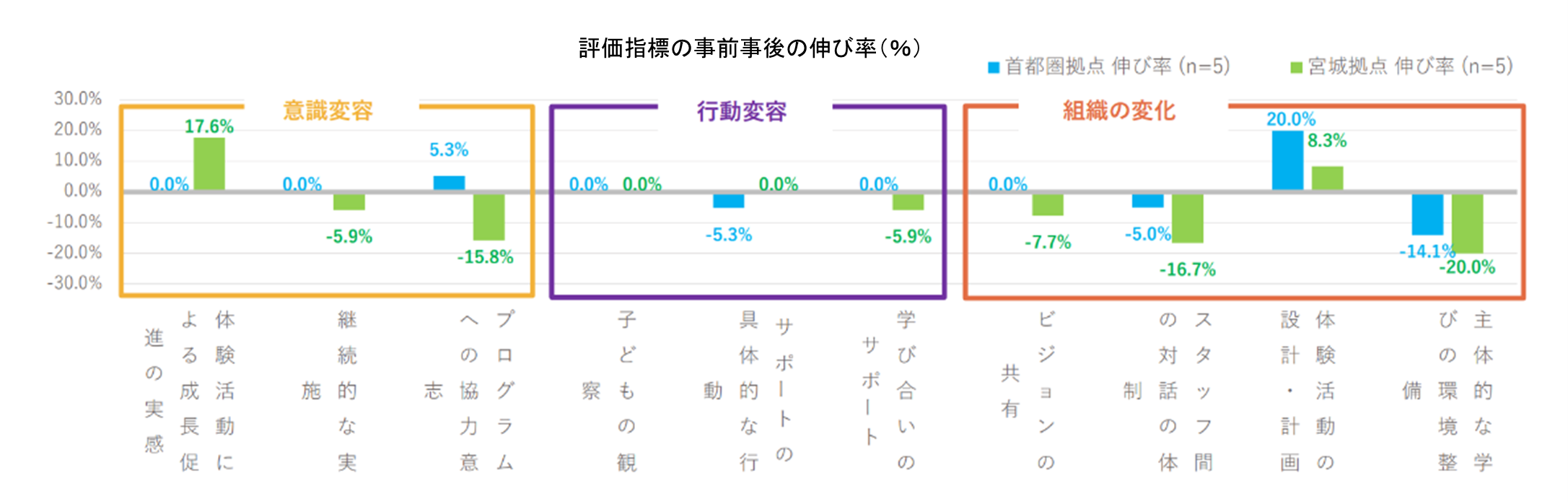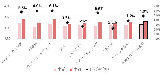 対して、事後の平均値は3.31となり、伸び率は4.9%でした。最も高い伸び率を示したのは、