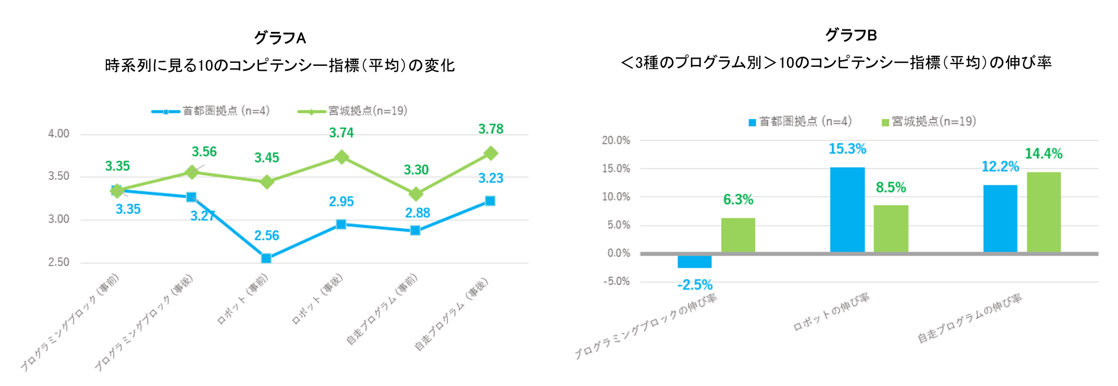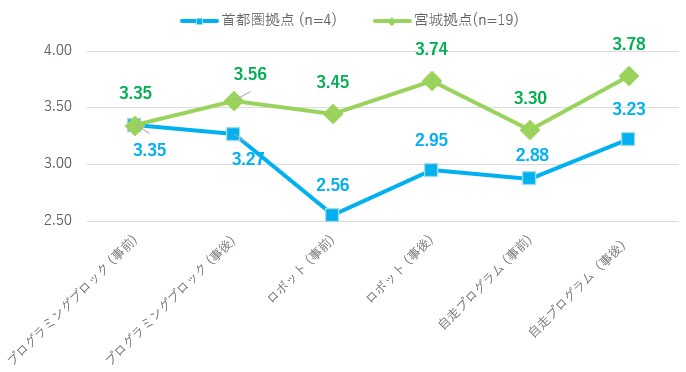・実施した2拠点ともに、ワークショップの回数を重ねることで、子どもたちのコンピテンシーの向上が