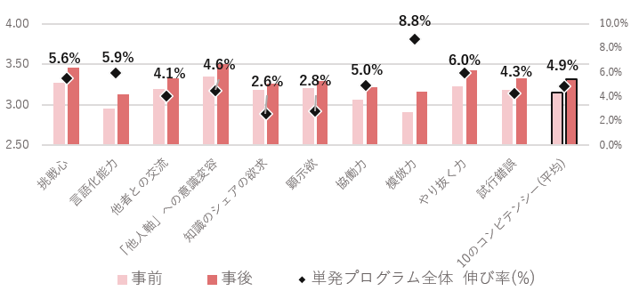 4.6%、4.9%であり、総じて類似した結果が得られました。単発プログラムが多岐にわたるコンピテンシーの