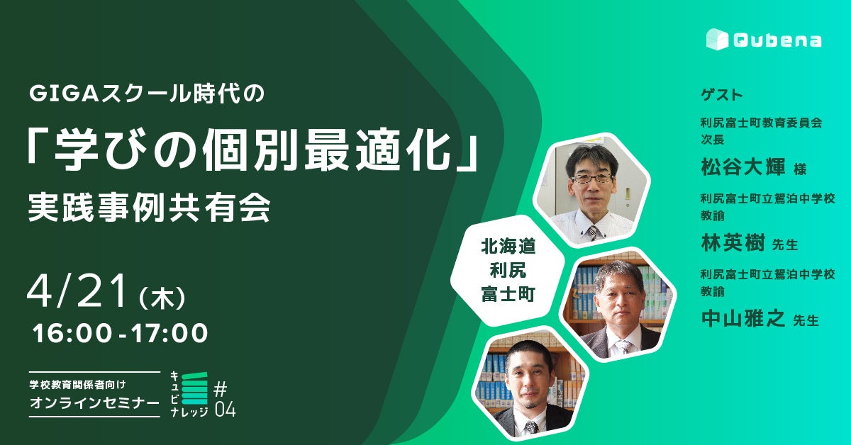 本セミナーでは同町教育委員会より松谷次長、町立鴛泊中学校より理科担当の林先生、社会科担当の中山先生をゲストにお迎えし、導入・活用推進の経緯や、子どもたちの主体的な学びにつなげるためのQubena活用の実践事例とその成果をご紹介いただきます。参加者の皆さまからのご質問にもお答えしてまいりますので、どうぞふるってご参加ください。
