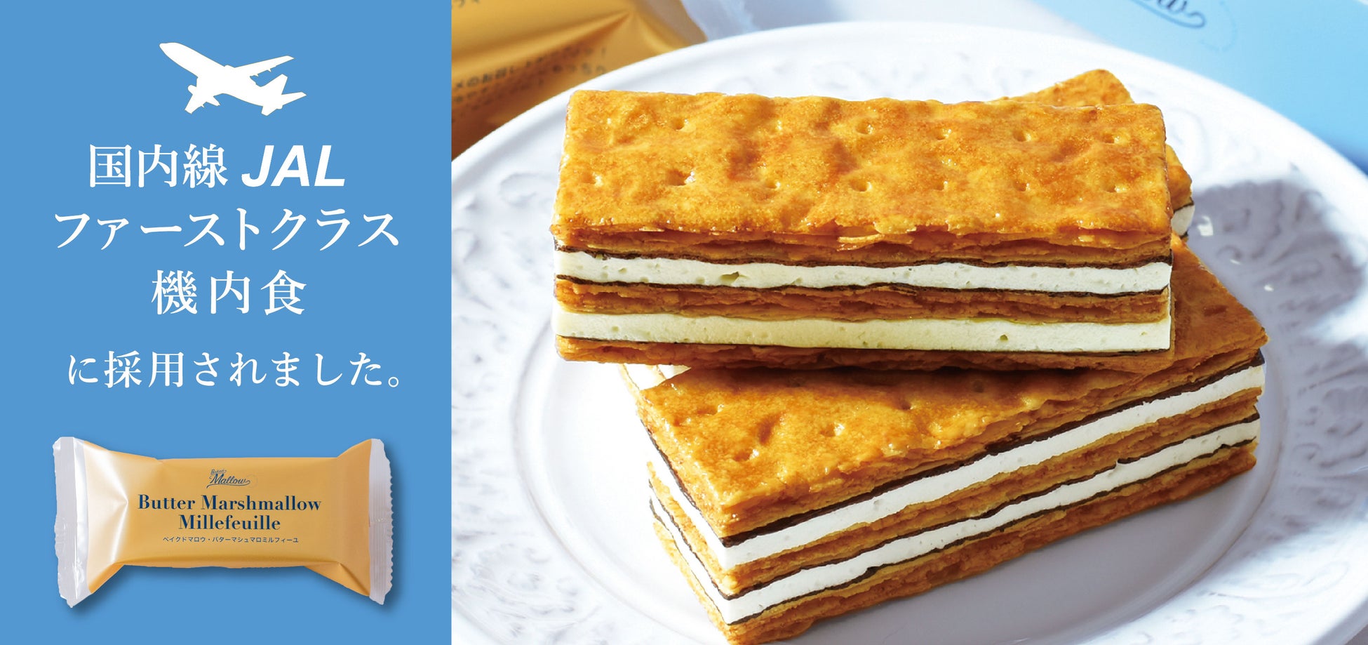 【ベイクドマロウ】バターマシュマロミルフィーユが国内線JALファーストクラス機内食に採用されました!