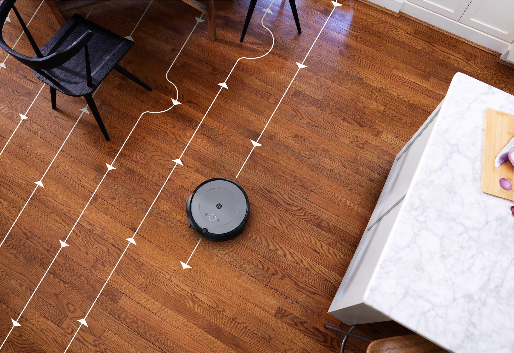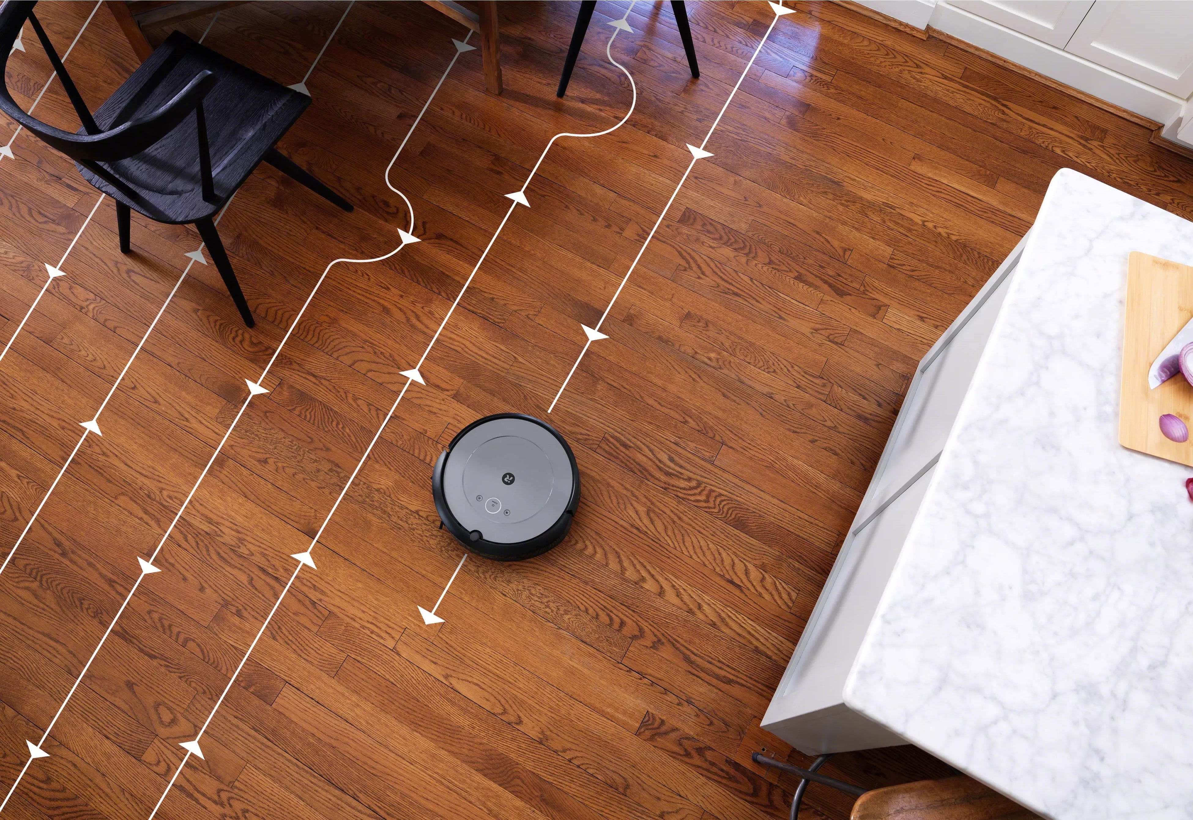 光学式マウスに似た技術を用いたフロアトラッキングセンサーによるナビゲーションやタイヤの回転数などでルンバが自己位置を特定し、カメラセンサーがなくても移動距離を把握しながら各部屋を移動し、無駄なく直線的・効率的に床を清掃します。また、バッテリー残量が少なくなると自動でホームベースに戻り充電。その後中断したところから再開し、掃除を最後までやり遂げます。