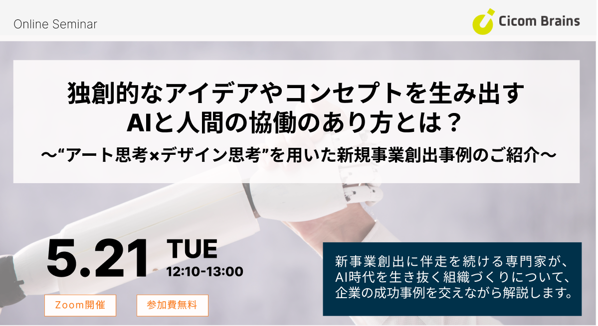 【独創的なアイデアやコンセプトを生み出すAIと人間の協働のあり方とは?~“アート思考×デザイン思考”を用いた新規事業創出事例のご紹介~】サイコム・ブレインズによる無料ウェビナーを5月21日(火)に開催