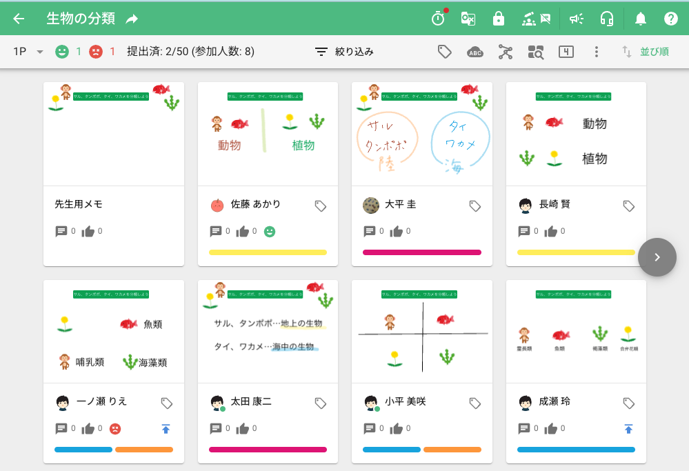 使用の一例として、理科の「サル、タンポポ、ワカメ、タイを分類しよう」という課題では、動物・植物での分類だけでなく、生息地による分類など、個人の視点により複数の回答が考えられます。先生が本機能を使い、児童生徒の回答をグルーピングすることで、児童生徒は1つの問いに対し、複数のアプローチや考え方があることを把握しやすくなります。