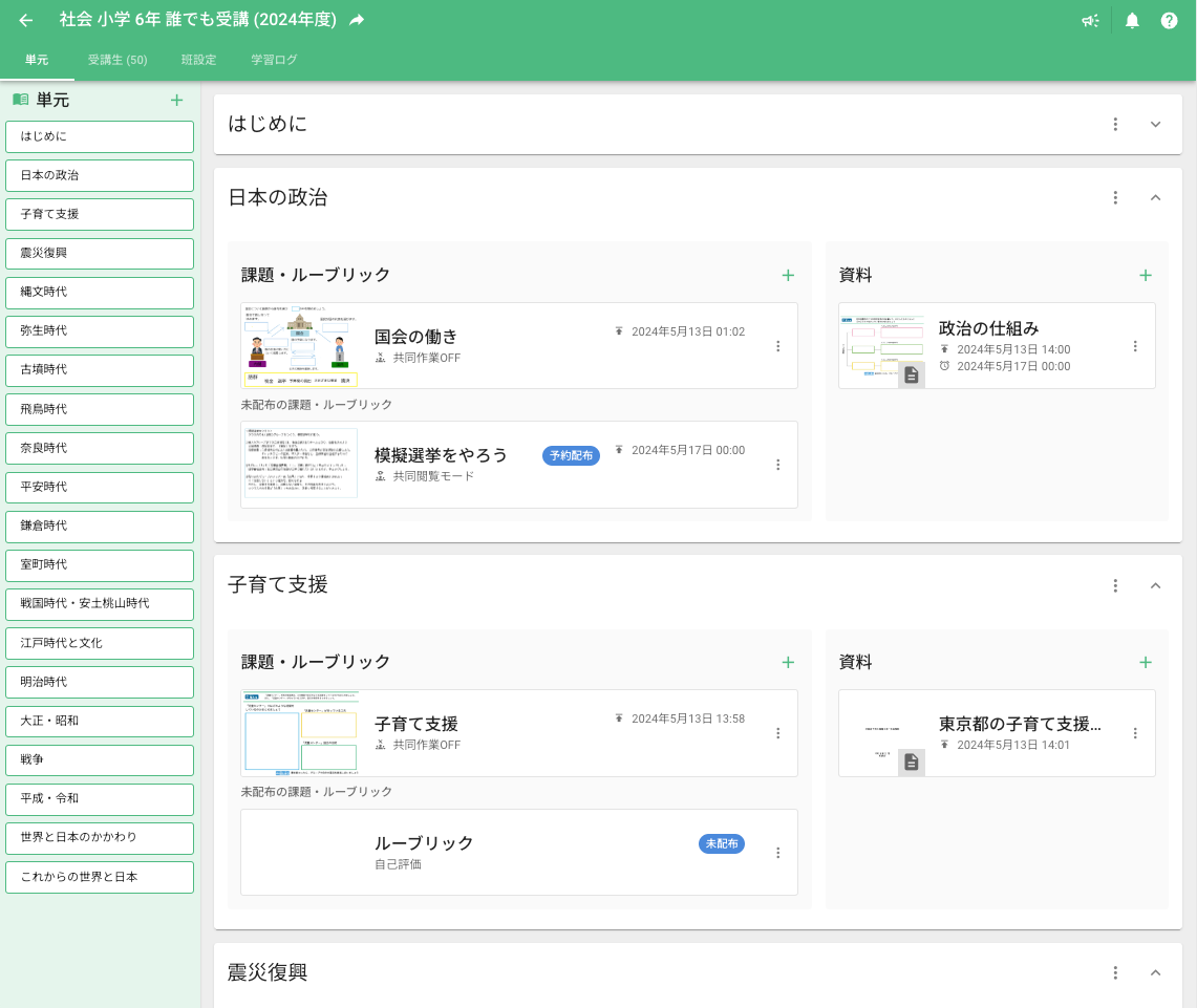 スクールタクトで授業を作る時に、先生は学年・科目別の単元をワンクリックでまとめて作成することができます。それぞれの単元に関連した課題テンプレートもより探しやすくなったため、授業で必要なワークシートを一から作る時間を削減できます。