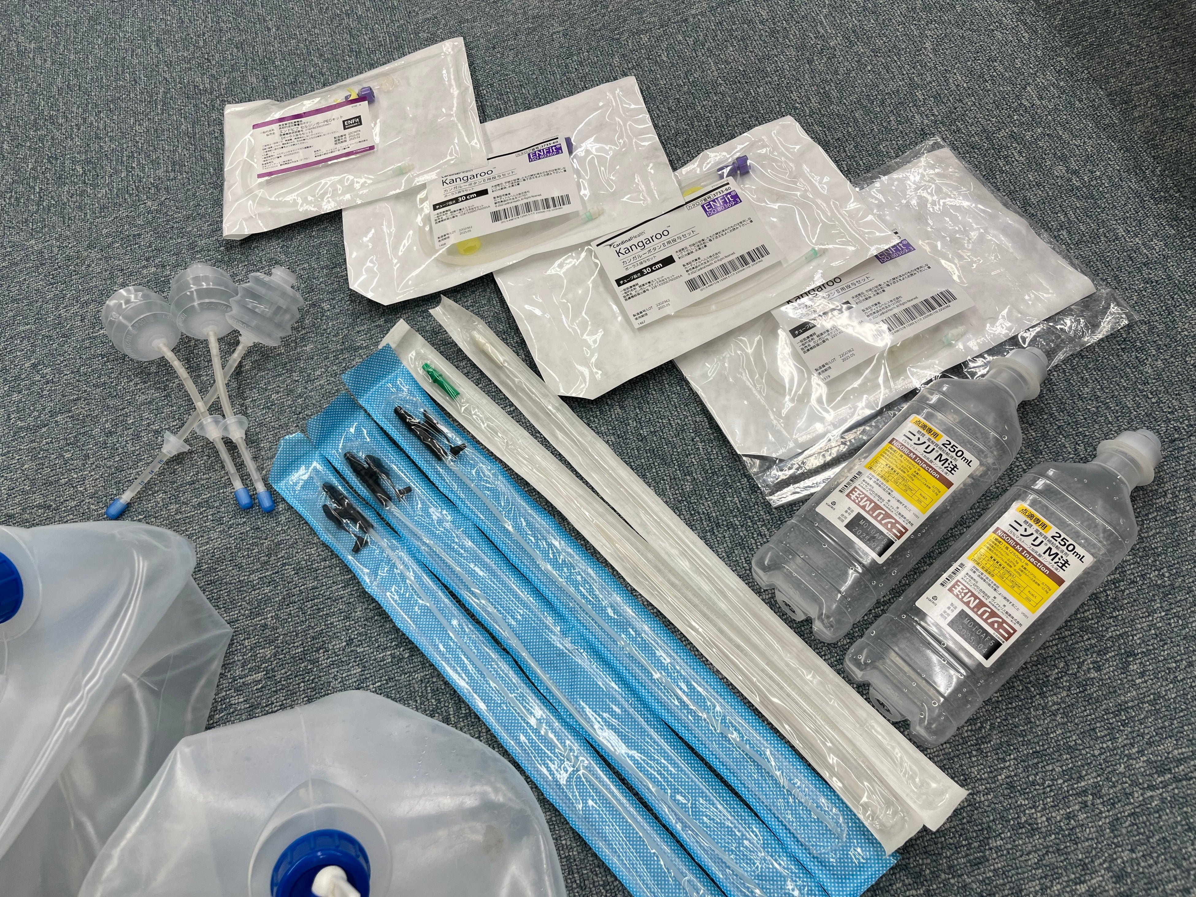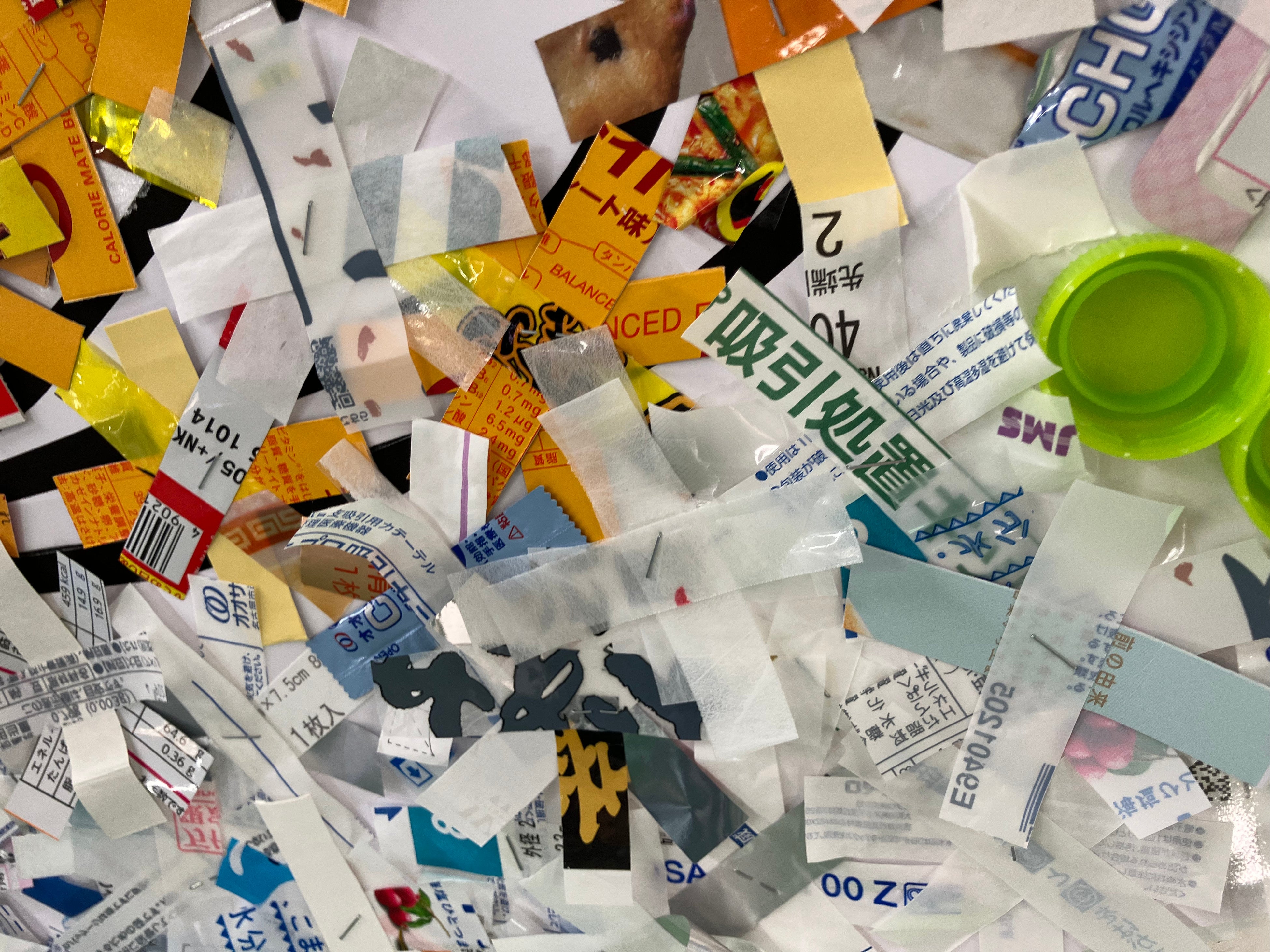 今回、使用期限が切れて処分する訪問看護の医療資材や家庭から出たゴミなどを集めて、廃材の短冊を準備しました。
