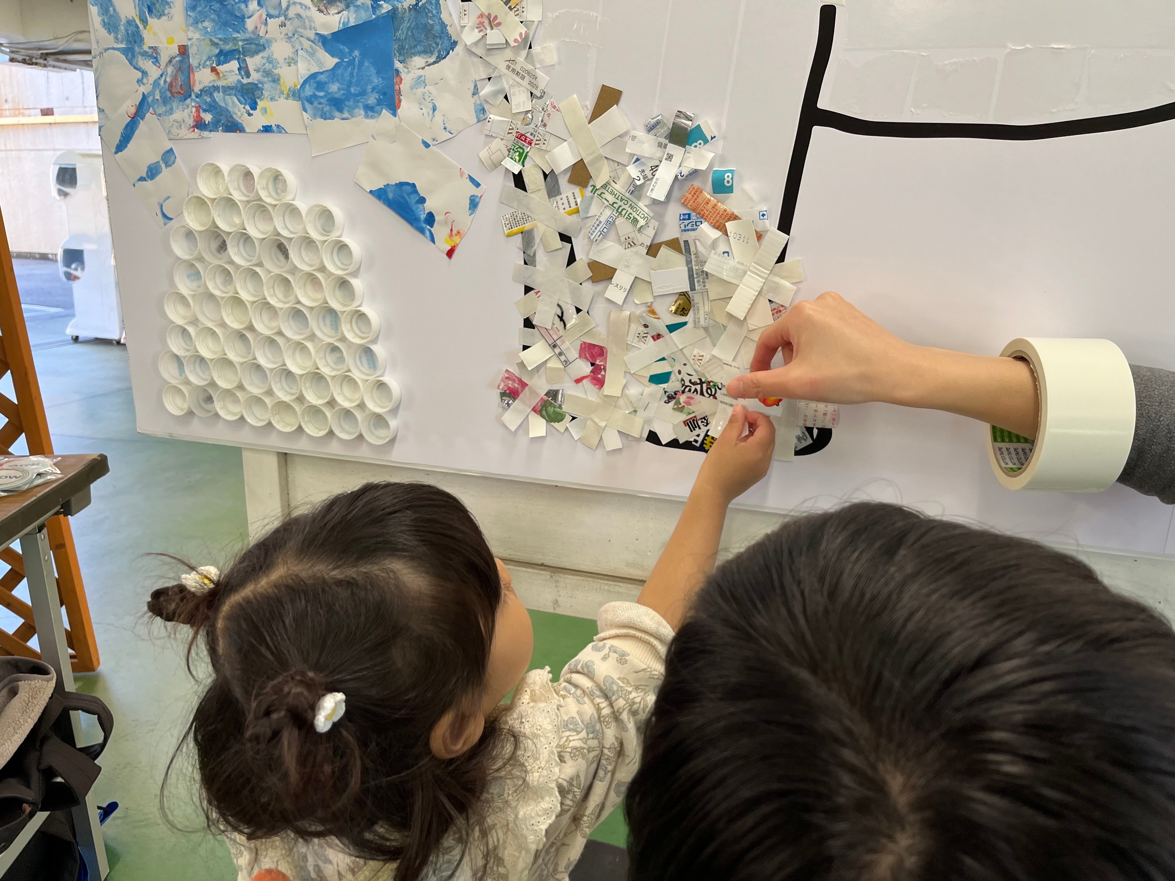 ブースでは、子どもたちをはじめ幅広い年代の皆さんが参加し、廃材パーツの一片一片を貼り合わせて“みんなの力でアートを完成” させるため、夢中になって取り組んでくれました。