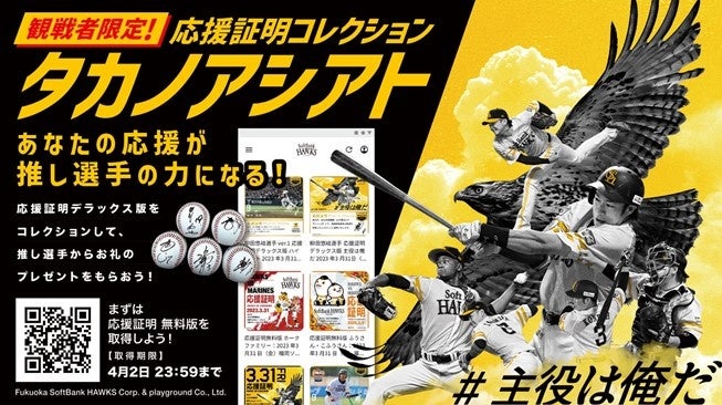 本企画は、宮崎キャンプにて好評だった「タカノアシアト(応援コレクション)」企画の第2弾です。一軍開幕戦を観戦したことを証明するNFT「応援証明」を無料で配布します。さらに、「応援証明」保有者を対象に、「#主役は俺だ」の選手ビジュアルを使用したデザインや、開幕戦当日のハイライトシーン、デジタルサイン等をデザインした「応援証明デラックス版」を限定販売します。