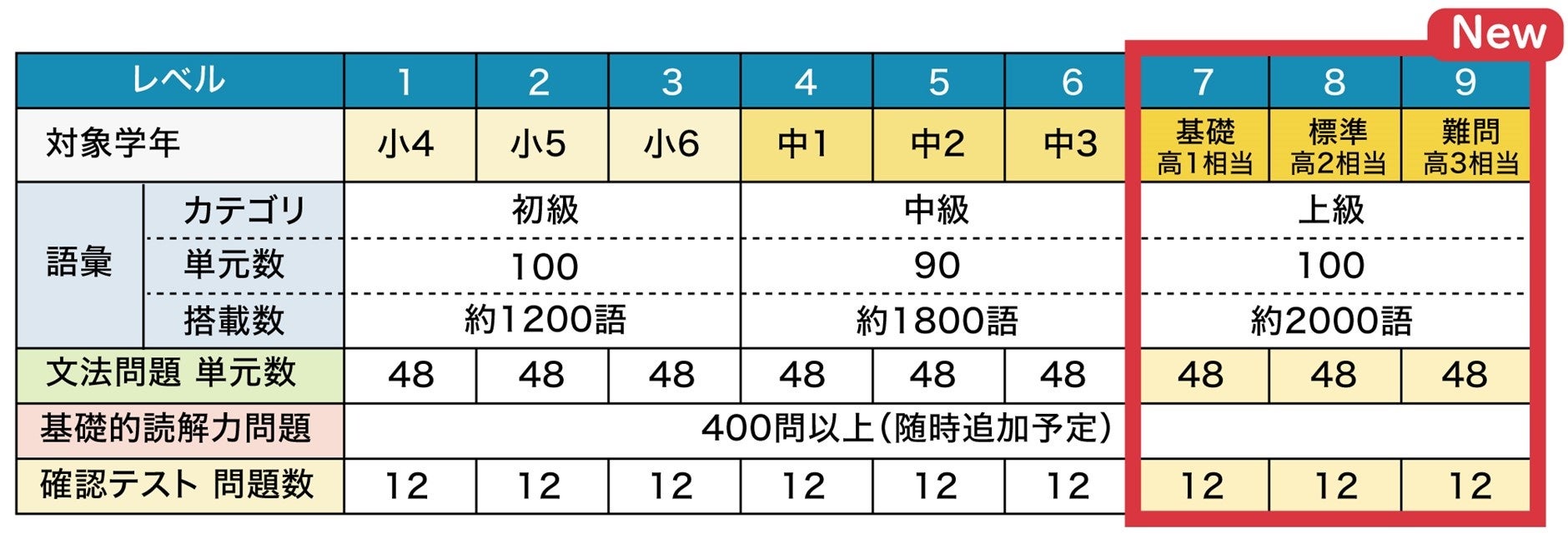 すでにリリースされている「語彙」「基礎的読解力(論理)」に加え、「文法」「確認テスト」を追加搭載し、高校生向けレベル7〜9をリリースいたします。