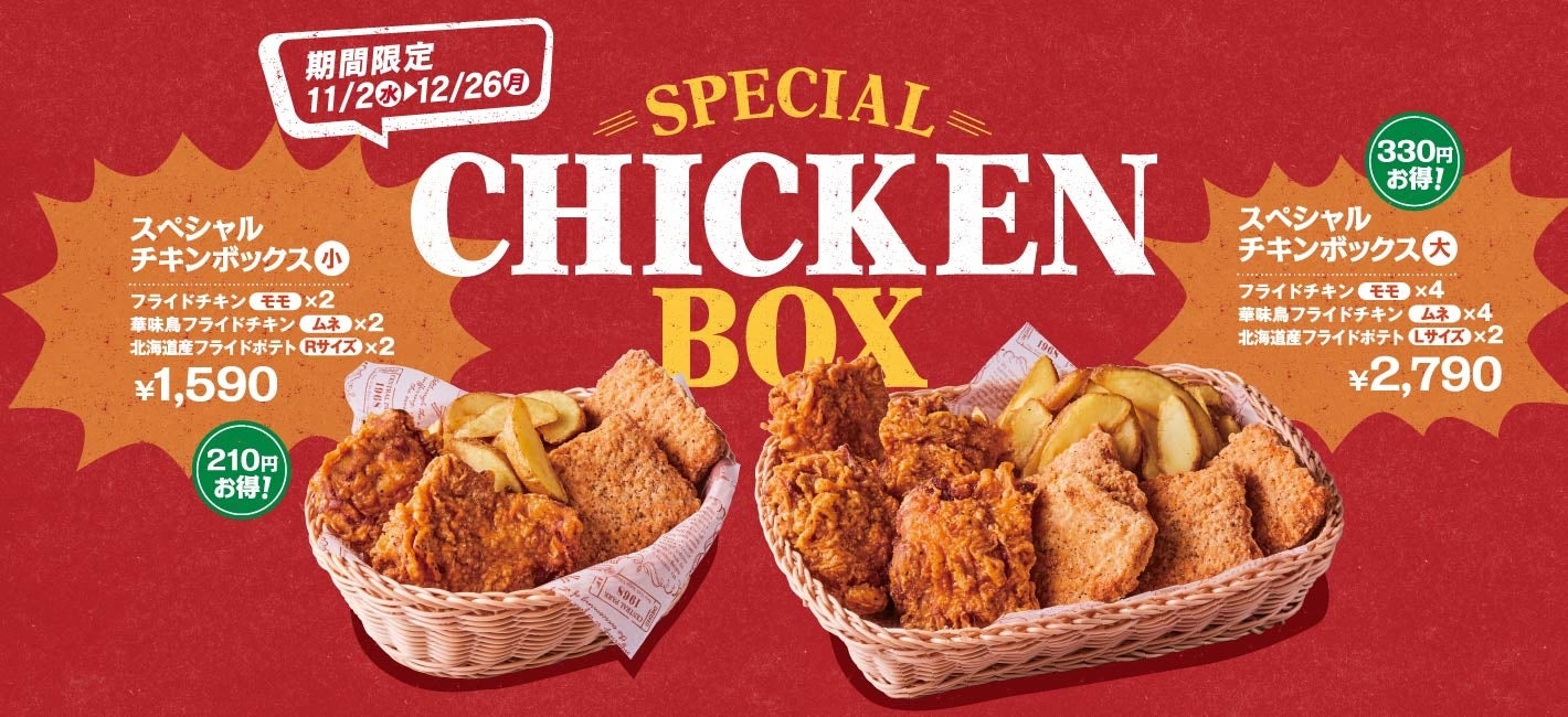 コロワイドグループの株式会社フレッシュネス(代表取締役社長:齋藤 健太朗/本社:神奈川県横浜市西区)は、2022年11月2日(水)より、ハンバーガーチェーン「フレッシュネスバーガー」にて、「スペシャルチキンボックス 小」「スペシャルチキンボックス 大」を期間限定発売いたします。
