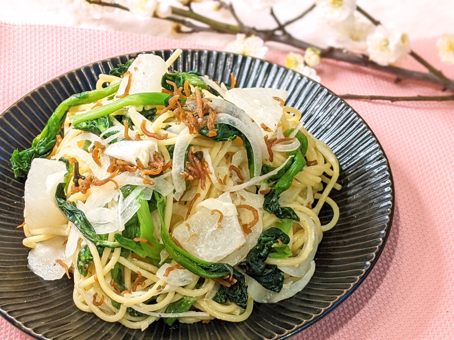 冬が旬のみずみずしい大根と、春を先取った菜の花を使用しました。ちりめん山椒がアクセントで、クリーミーなアンチョビソースがクセになるパスタサラダです。