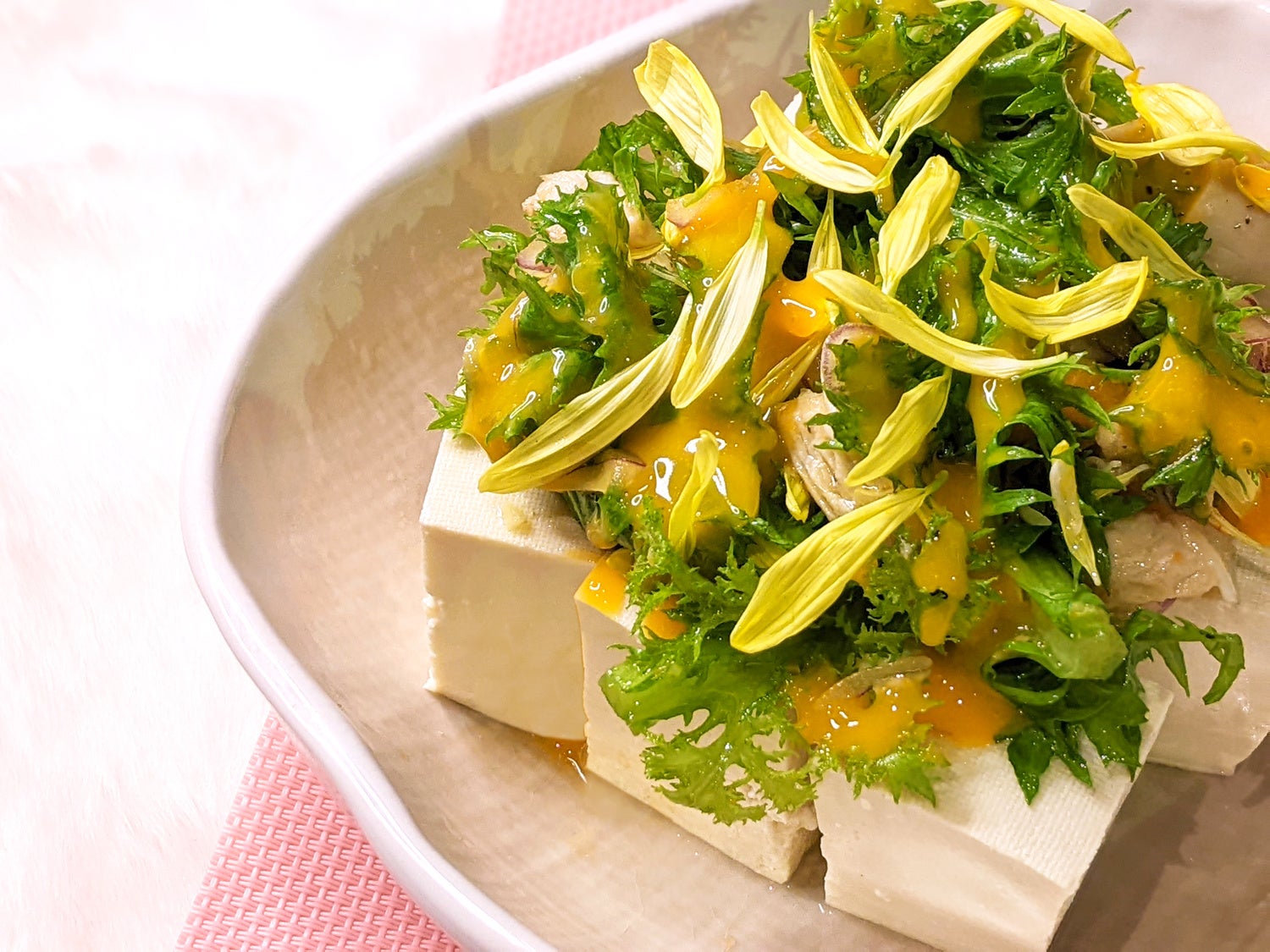 ピリっとした辛味が特徴的なわさび菜と、食べ応えのあるチキンと豆富のサラダです。濃厚な卵黄ソースが、マイルドに包み込みます。