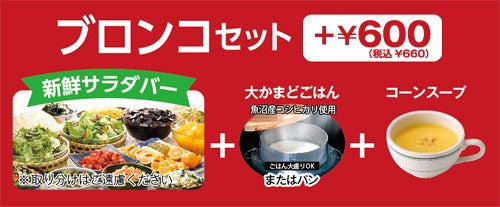 内 容:新鮮サラダバー・魚沼産コシヒカリ大かまどごはん(又はパン)・コーンスープ