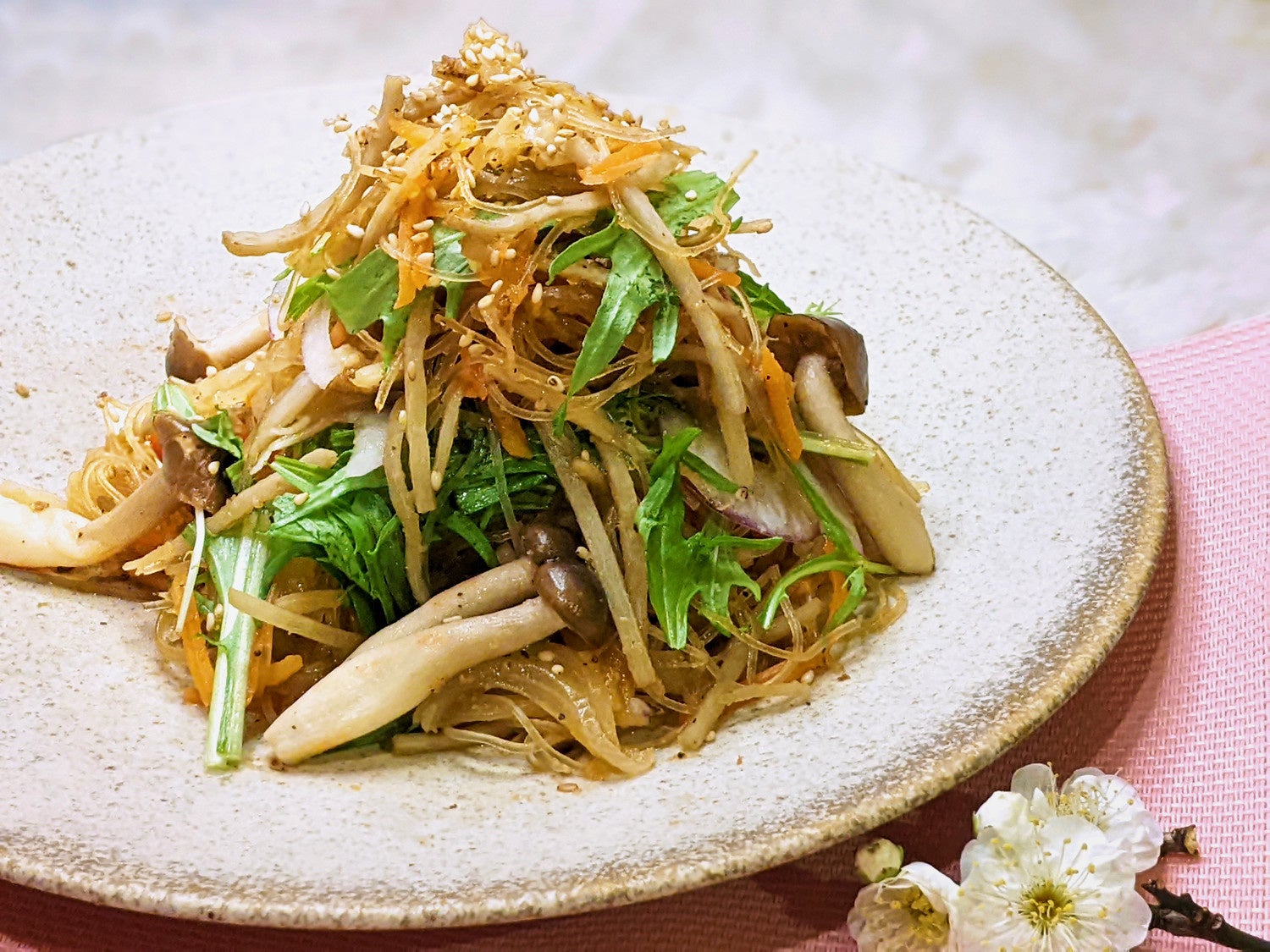 旬のごぼうとしめじを、ステーキソースをアレンジした特製のタレで和えました。牛ミンチで肉の旨みが加わり、軽やかな春雨の食感とごぼうのシャキシャキ食感が楽しいチャプチェ風サラダです。おつまみとしても最適な一品です。