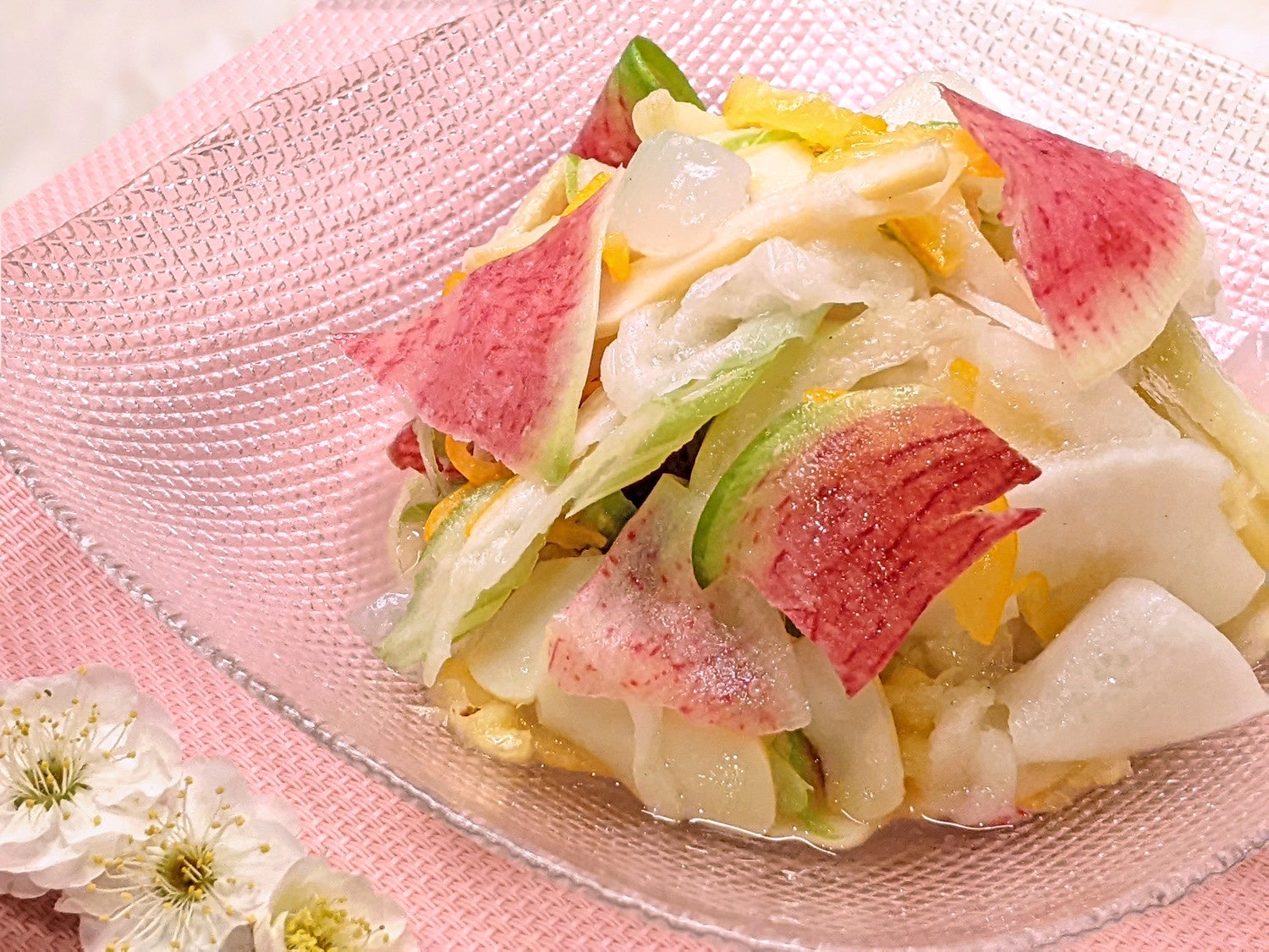2種の大根で紅白色、金柑のオレンジ色、ナタデココのキラキラが、まるで春の花々が咲き始めたかのように彩り豊かに。それぞれの甘みや酸味を燻製イカの深い旨みで、バランスよくまとめました。