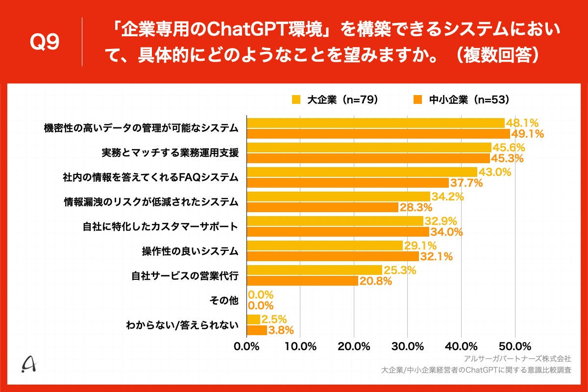 Q8で「非常にそう思う」「ややそう思う」と回答した方に、「Q9.「企業専用のChatGPT環境」を構築できるシステムにおいて、具体的にどのようなことを望みますか。(複数回答)」と質問したところ、大企業(n=79)は「機密性の高いデータの管理が可能なシステム」が48.1%、「実務とマッチする業務運用支援」が45.6%、中小企業(n=53)は機密性の高いデータの管理が可能なシステム」が49.1%、「実務とマッチする業務運用支援」が45.3%という回答となりました。