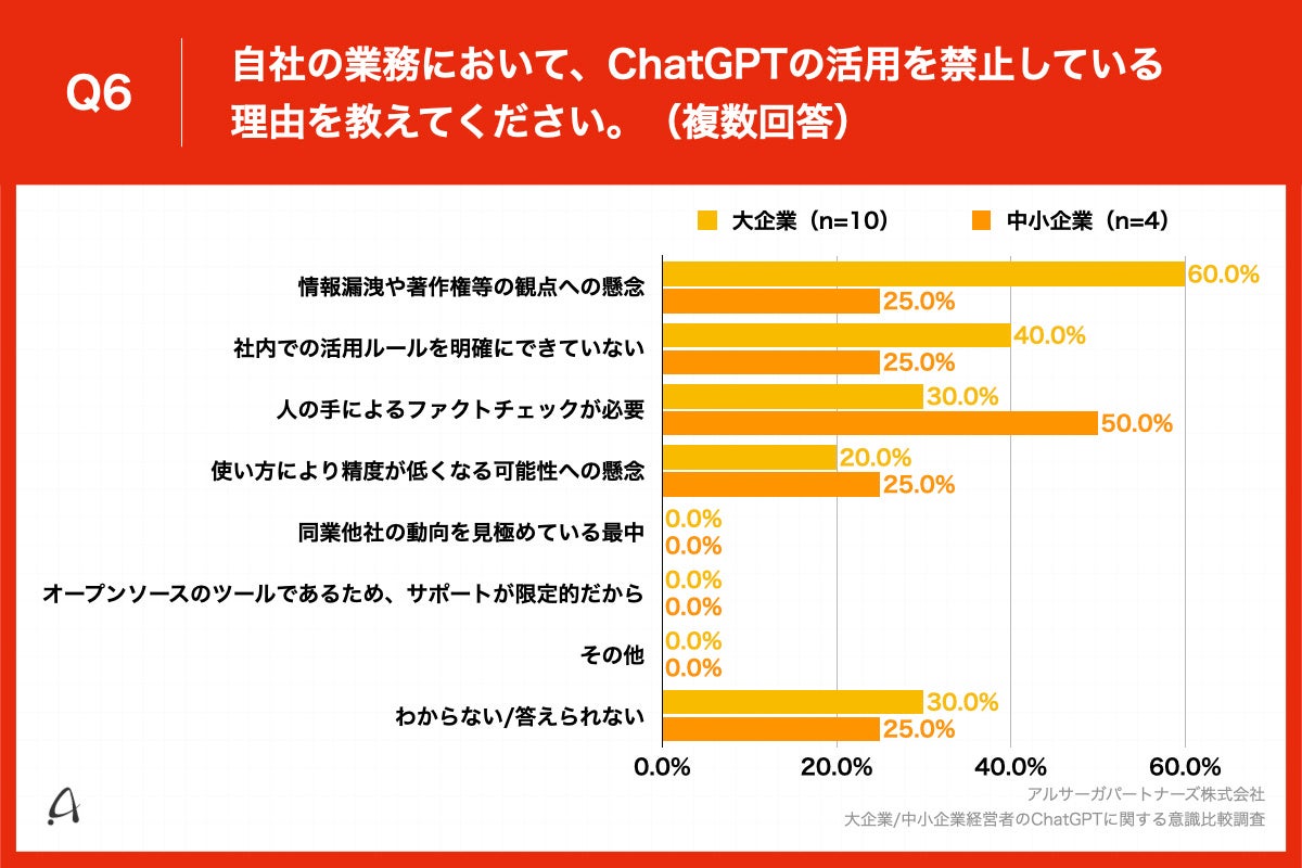 Q3で「活用を禁止している」と回答した方に、「Q6.自社の業務において、ChatGPTの活用を禁止している理由を教えてください。(複数回答)」と質問したところ、大企業(n=10)は「情報漏洩や著作権等の観点への懸念」が60.0%、「社内での活用ルールを明確にできていない」が40.0%、中小企業(n=4)は「人の手によるファクトチェックが必要」が50.0%、「情報漏洩や著作権等の観点への懸念」が25.0%という回答となりました。
