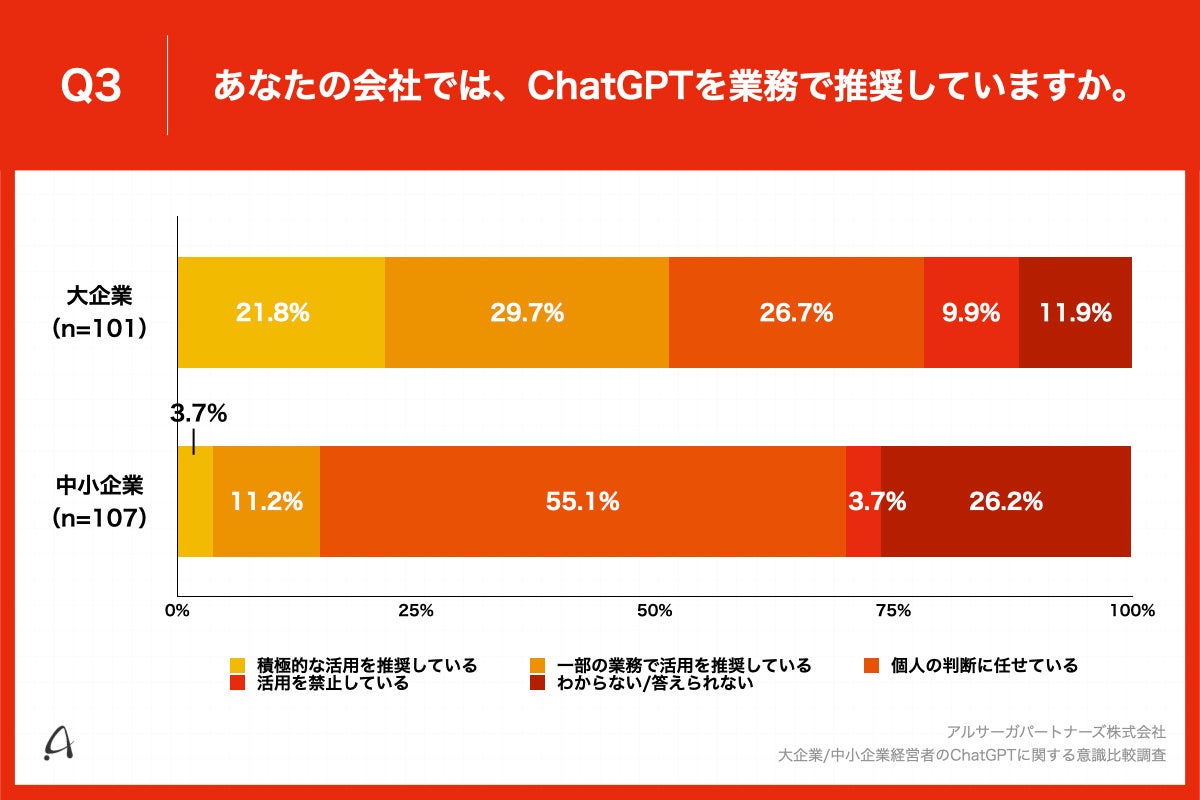 大企業は21.8%、中小企業の3.7%が「ChatGPTの積極的な活用を推奨」、大企業は中小企業より18.1ポイント高い結果に