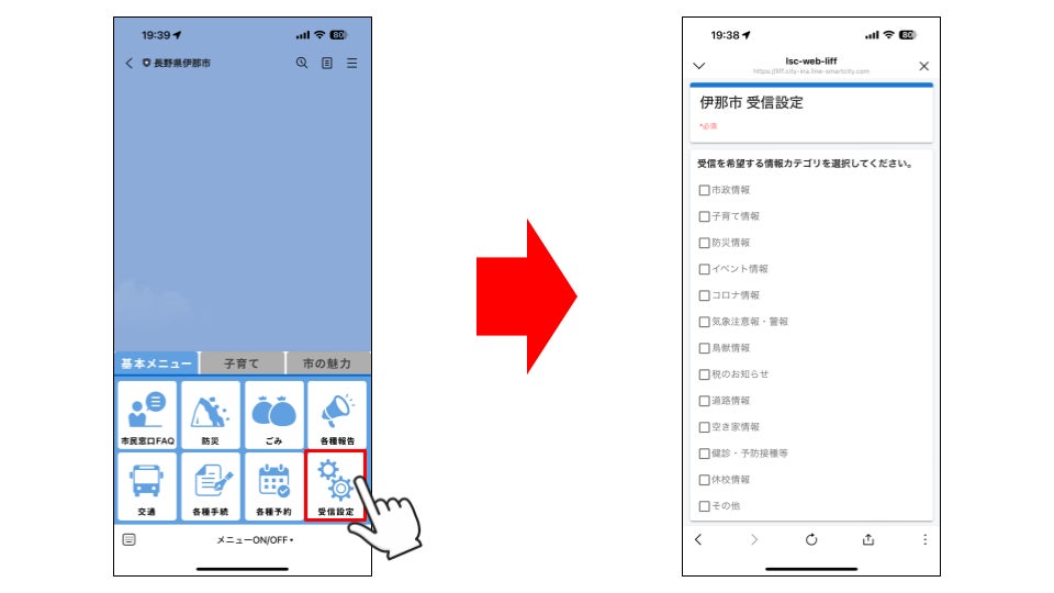 これまではLINEに登録している全ての住民に送られていた配信ですが、リニューアル後からは欲しい配信カテゴリーを選択することができます。