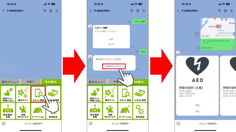 さらに、今回のリニューアルで最も注目すべき機能は「スポット検索機能」です。自分の現在地をLINEに送信することで、近くのAEDやWi-Fiスポットを検索することができます。