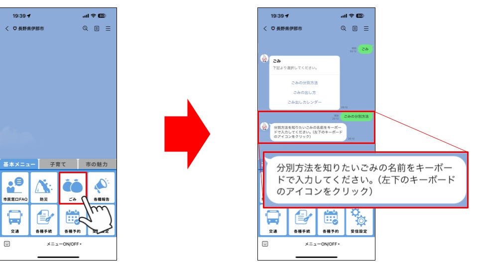特に基本メニューの「ごみ」からは、分別方法を知りたいごみの品目をキーボードから入力することで、分別方法が自動返答されるようになりました。気になったときにすぐ分別方法が確認できるのは、進化した点の1つといえます。