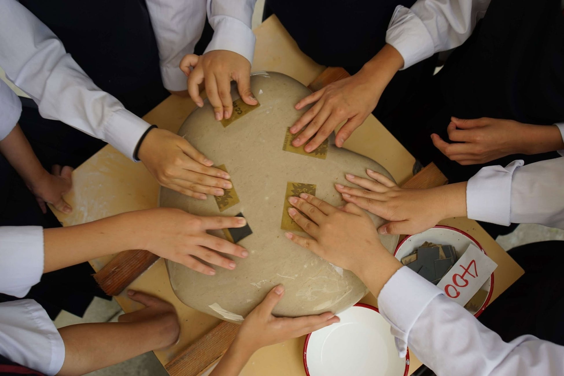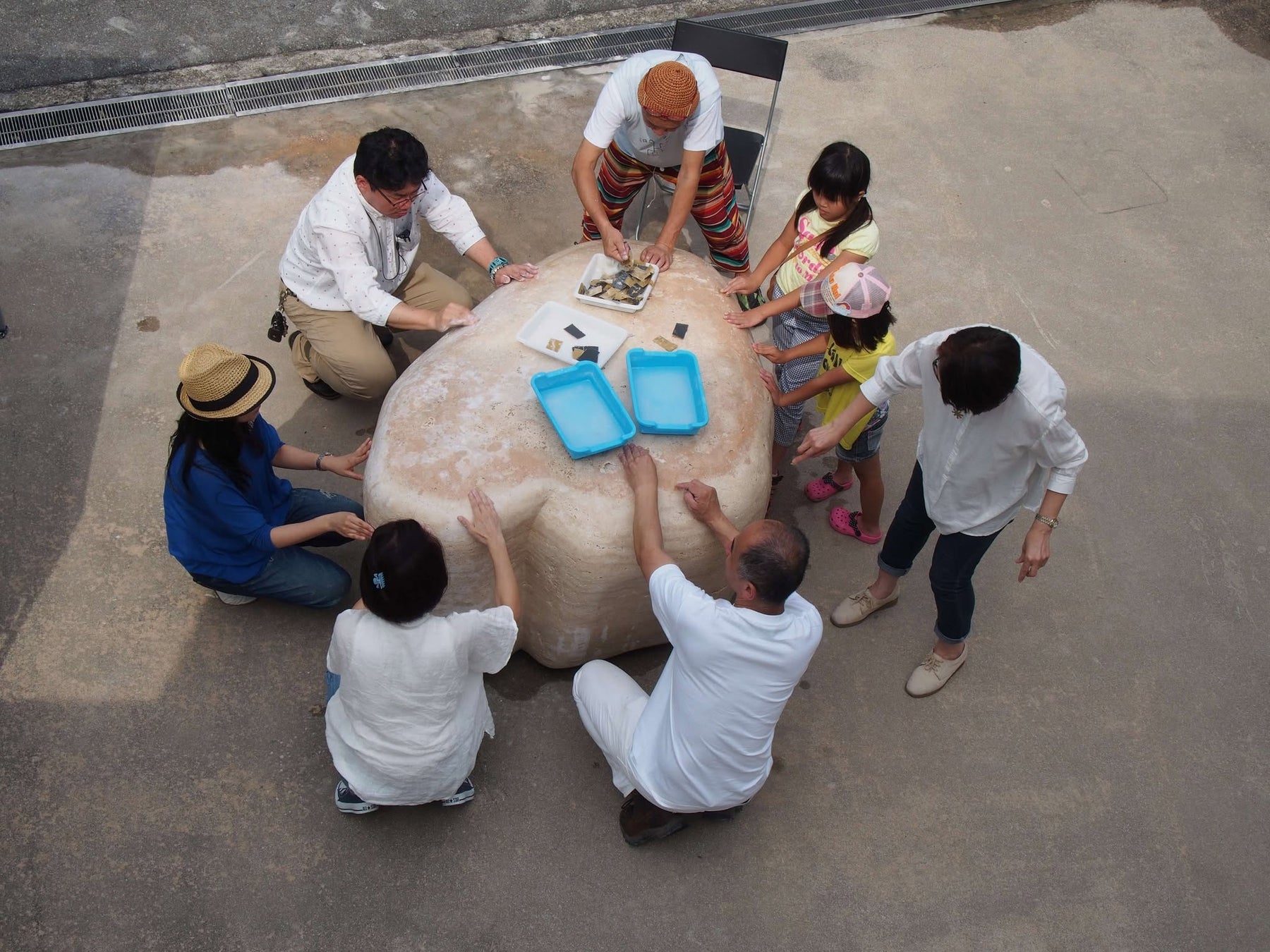 石は7段階(80番、200番、400番、800番、1500番、3000番、6000番)のやすりを磨くことでピカピカに輝きます。本プロジェクトでは、会期中、7段階のやすりを会場に用意をして参加者は用意したやすりを持ち石に触れながら水磨きを行います。磨く期間は4月の万博開催時期から10月の終了までを期間として、最初はざらざらであった5つの石が、終了時には輝き、5つの石は夢洲の空を映し出します。途中段階の石はそれぞれの段階で異なった魅力を放ち、来場者の目を楽しませてくれます。