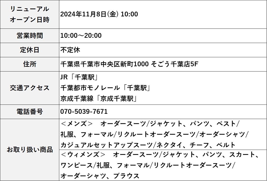 株式会社オンワードパーソナルスタイル(本社:東京都港区 代表取締役社長:関口 猛)は、オーダーメイドの『KASHIYAMA』(https://kashiyama1927.jp/)において、千葉エリア唯一の店舗「KASHIYAMA そごう千葉店」を11月8日(金)に売場面積を拡大しリニューアルオープンいたします。