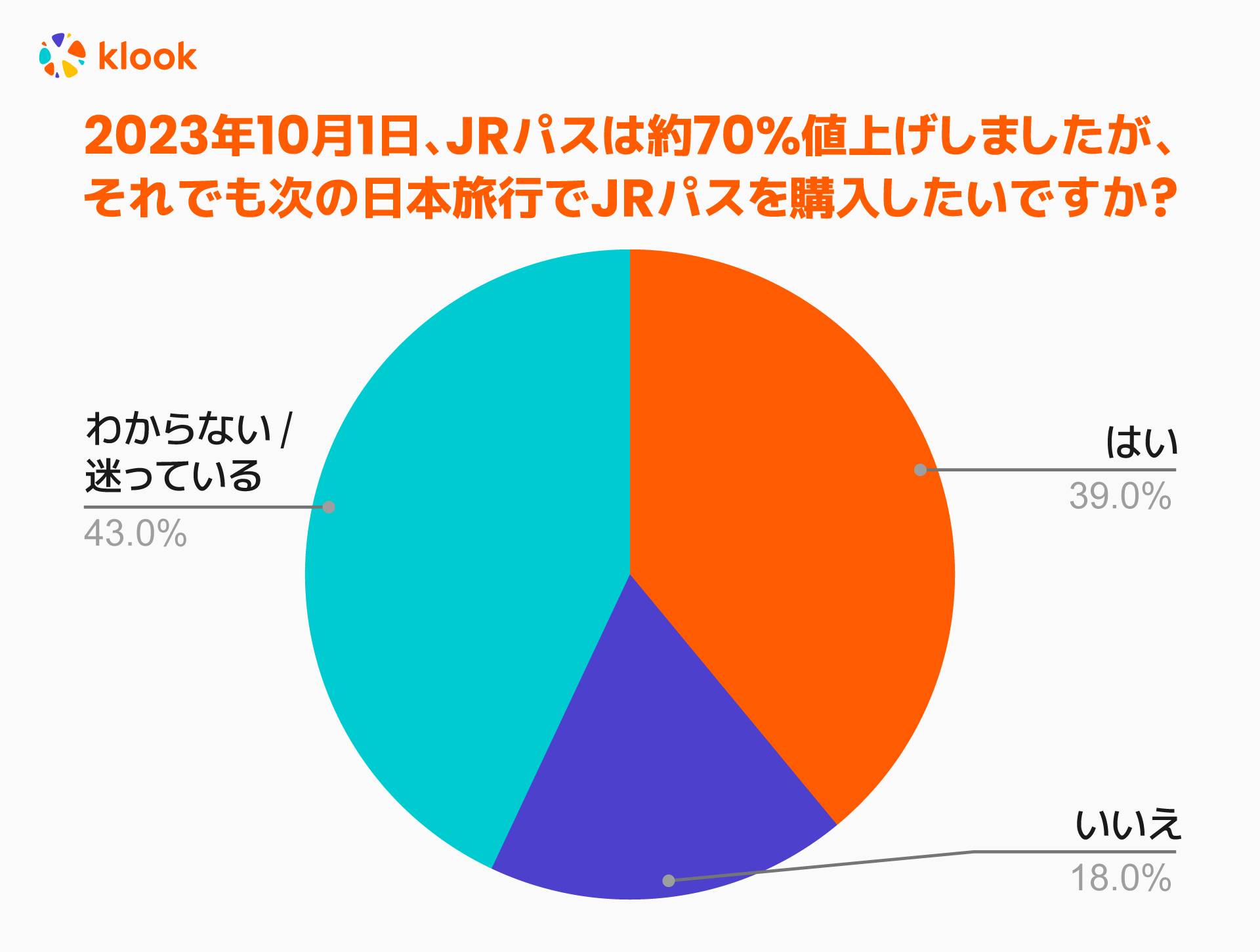 鉄道乗り放題の周遊パスであるJRパスは、長年の間、訪日外国人観光客にとって日本を旅行するための重要かつ大変人気のある交通手段であり、今回の大幅値上げは海外市場でも驚きを持って伝えられました。そこで今回、訪日客の25%、4人に1人*が利用する旅行・レジャー予約サイトKlookがSNS上で実際に日本への旅行を計画しておりJRパスについて知っているアジア太平洋市場の18歳以上の男女を対象に緊急アンケートを行い、JRパスの値上げによる訪日旅行への影響を調査しました。