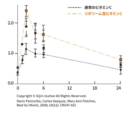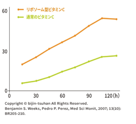 従来の水溶性ビタミンCは、約2~3時間で使用されなかったものは体外へ排出される、量を多くとっても実際に体内に止まるのは200mg~250mg、生活する上でストレスや紫外線、喫煙などにより消費されやすいことが弱点でした。