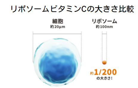 通常のビタミンCよりずっと微小なサイズ(細胞の約200分の1)にナノ化したビタミンC。 そのため、カラダの隅々の細胞まで入り込みやすく、体内での吸収性・浸透性に優れて います。 また、カラダに長くとどまるため、通常のビタミンCよりも効果が持続します。