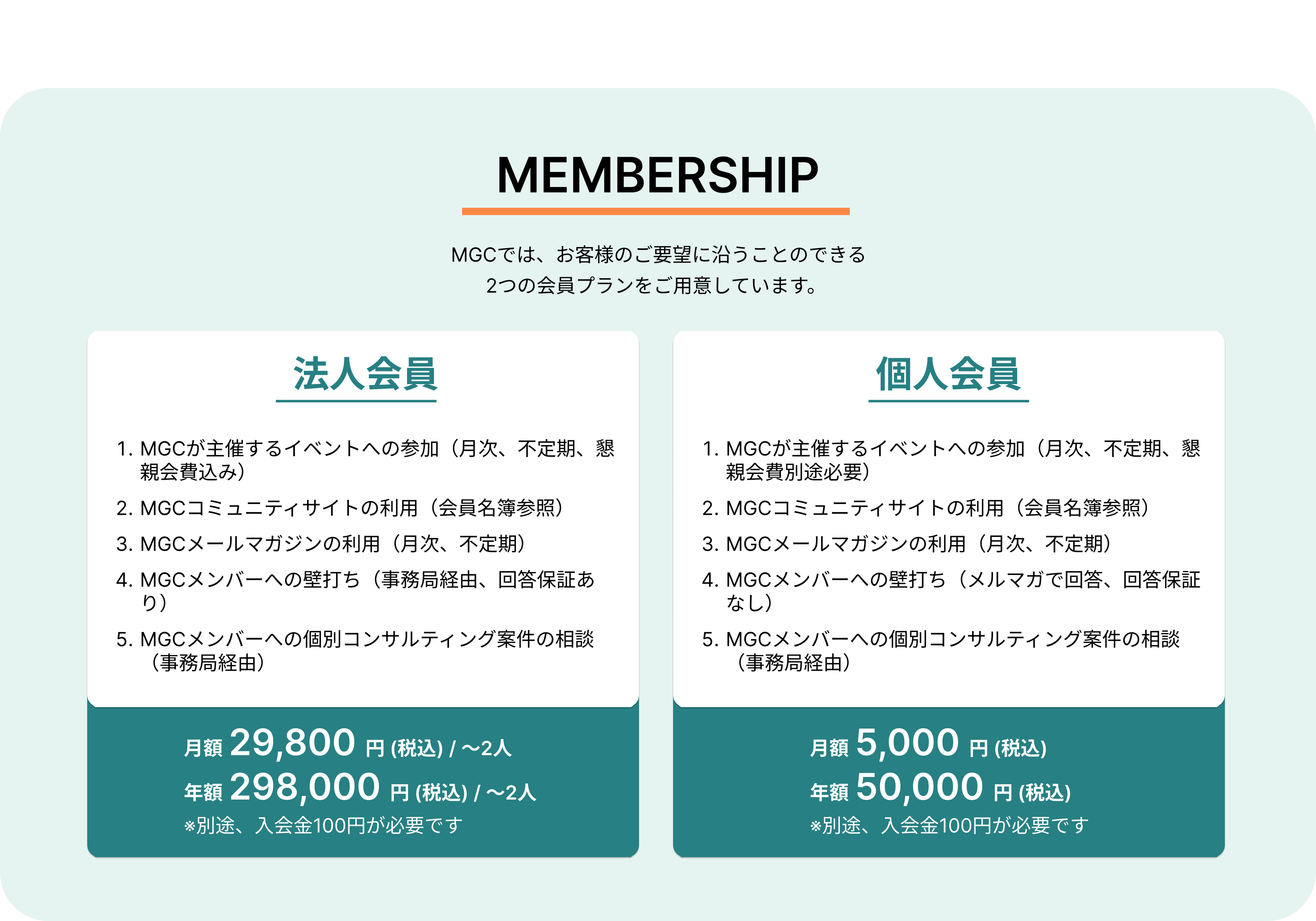 また、MGCでは、法人会員と個人会員があり、以下のような特典をご用意しています。