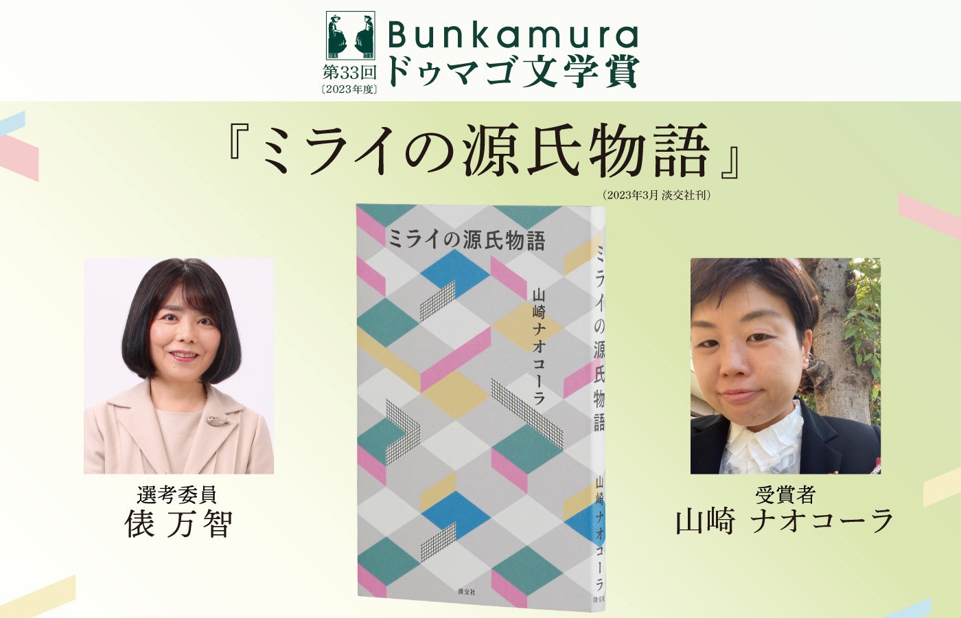 33回を迎えるBunkamuraドゥマゴ文学賞。先進性と独創性のある、新しい文学の可能性を探りたいと考え、受賞作は、毎年交代する「ひとりの選考委員」によって選ばれます。今年度の受賞作は山崎ナオコーラ著『ミライの源氏物語』に決定し、選考委員を務めた俵万智は「『古典をなぜ読むのか?』という古くからある問いに対して、これほど明快で深い、それでいて新しい答えに、私は出会ったことがない。」と評しています。選評と受賞の言葉の全文はホームページに掲載しています。