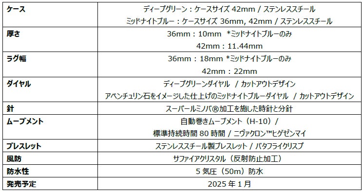現代的で個性が際立つ、洗練されたモデルをお求めの方には、ダークなミッドナイトブルー文字盤を備えた、36mmと42mmのケースサイズをラインナップ。アベンチュリン(砂金水晶)にインスパイアされた文字盤は、星空と宇宙の無限を反映し、きらめく粒子が散りばめられています。