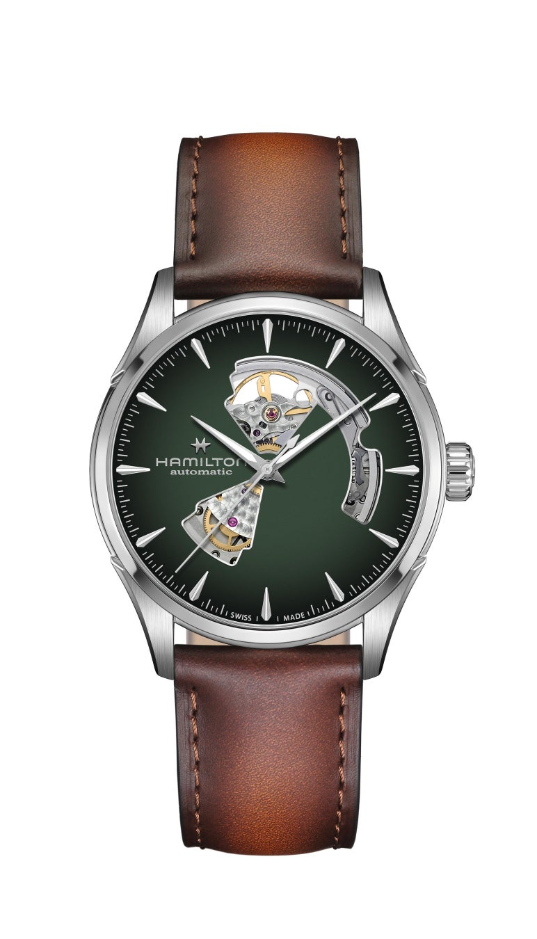 洗練されたハミルトンらしさを纏う「ジャズマスター オープン ハート」は、クリエイティビティと都会的なスタイリッシュさが融合しています。「時計の心臓部への扉」と名付けられたこの時計に、ディープグリーンとミッドナイトブルーの2色が新たに加わります。