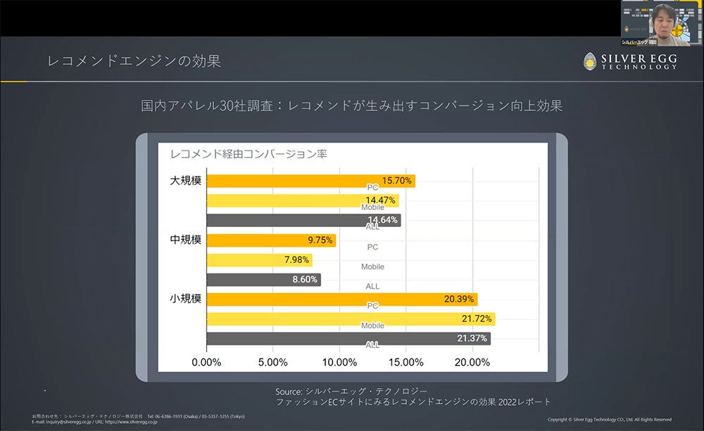 その結果、コンバージョン率も大きく向上できます。アパレル企業30社を対象とした自社調査の結果では、レコメンドを多様な形で使いこなすことで売上の1・2割を生み出すことができることがわかっています。