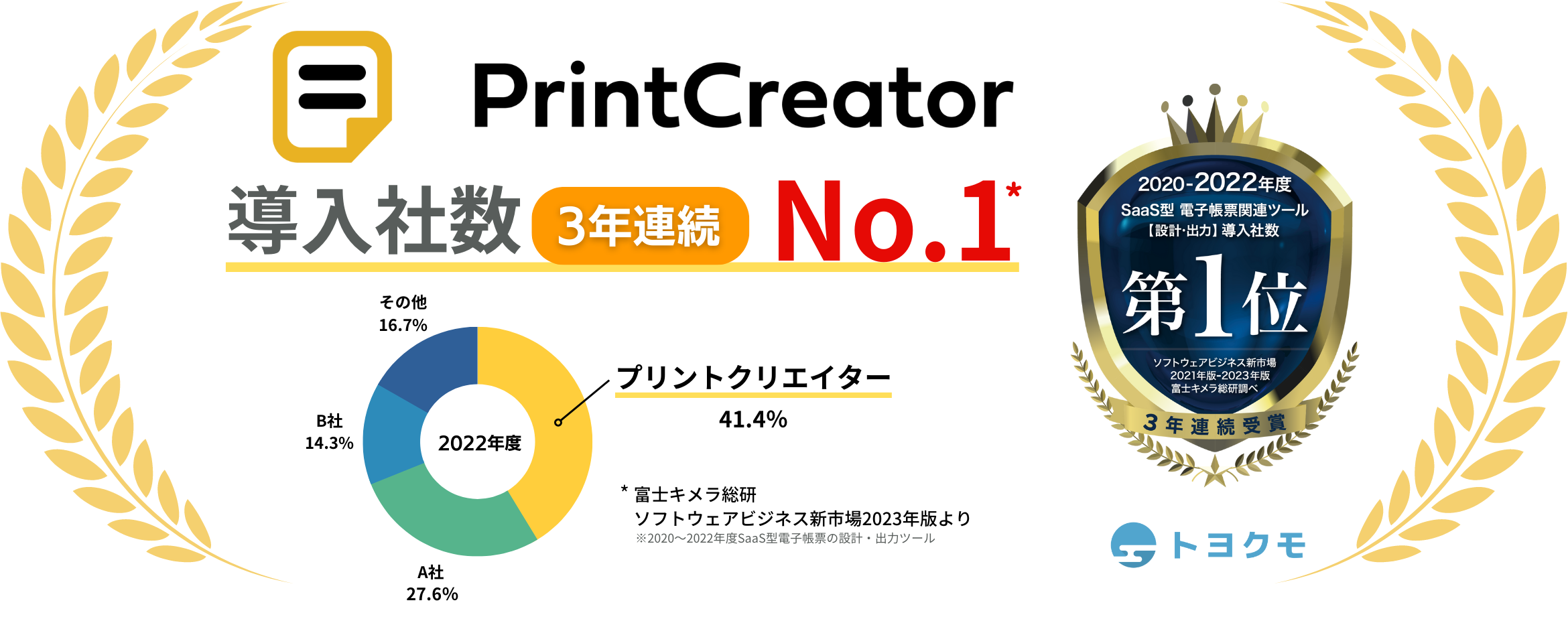 日頃よりご愛顧いただいておりますお客様、パートナーの皆様のおかげをもちまして、一昨年、昨年に引き続き3年連続で「ソフトウェアビジネス新市場2023年版」のSaaS型電子帳票の設計・出力ツールにて、プリントクリエイターが導入件数No.1という結果となりました。皆様のご支援に心より感謝申し上げます。