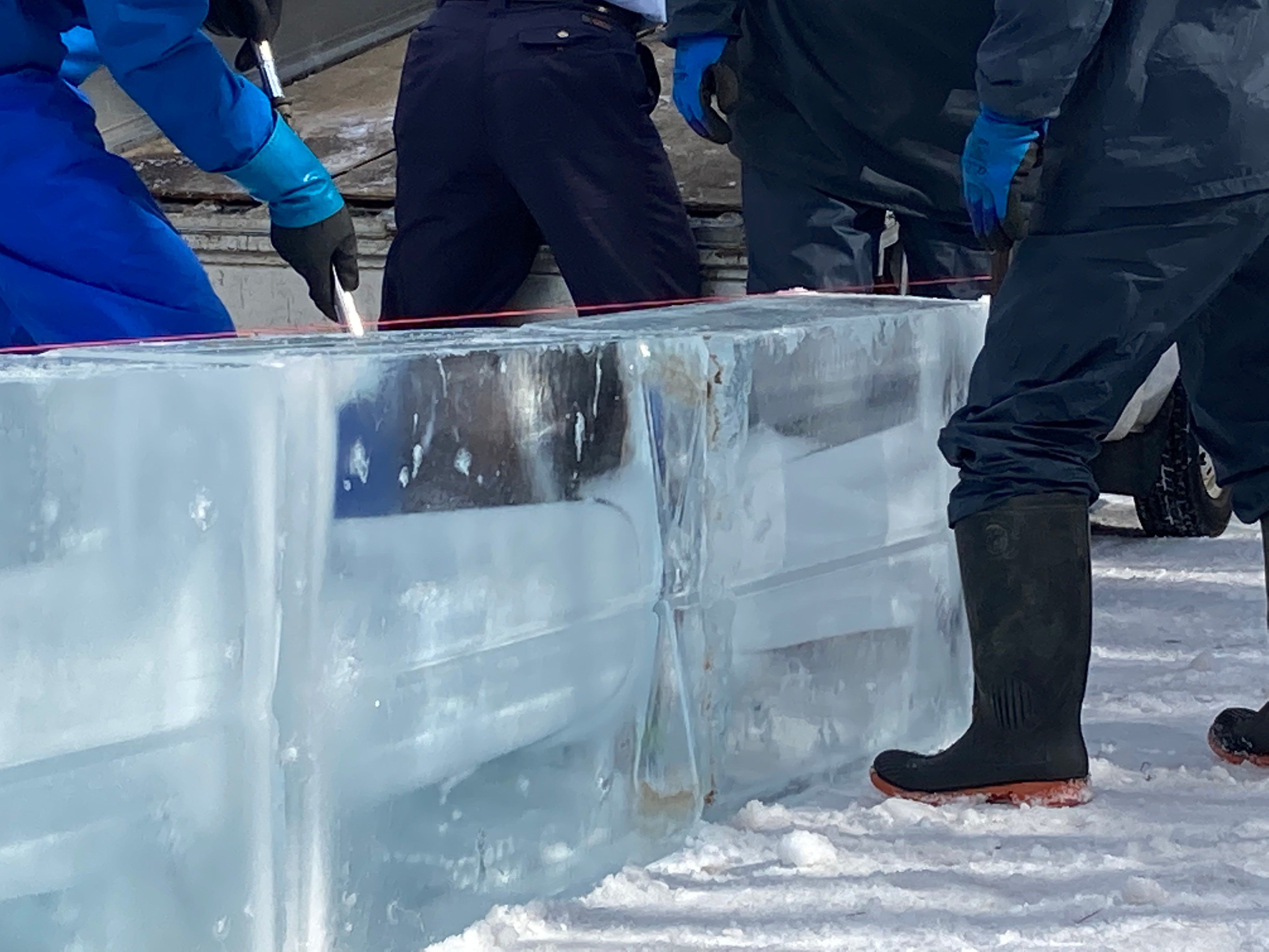 1つのブロックだけで約100キロあるので、氷の設置は数人がかりで行います。
