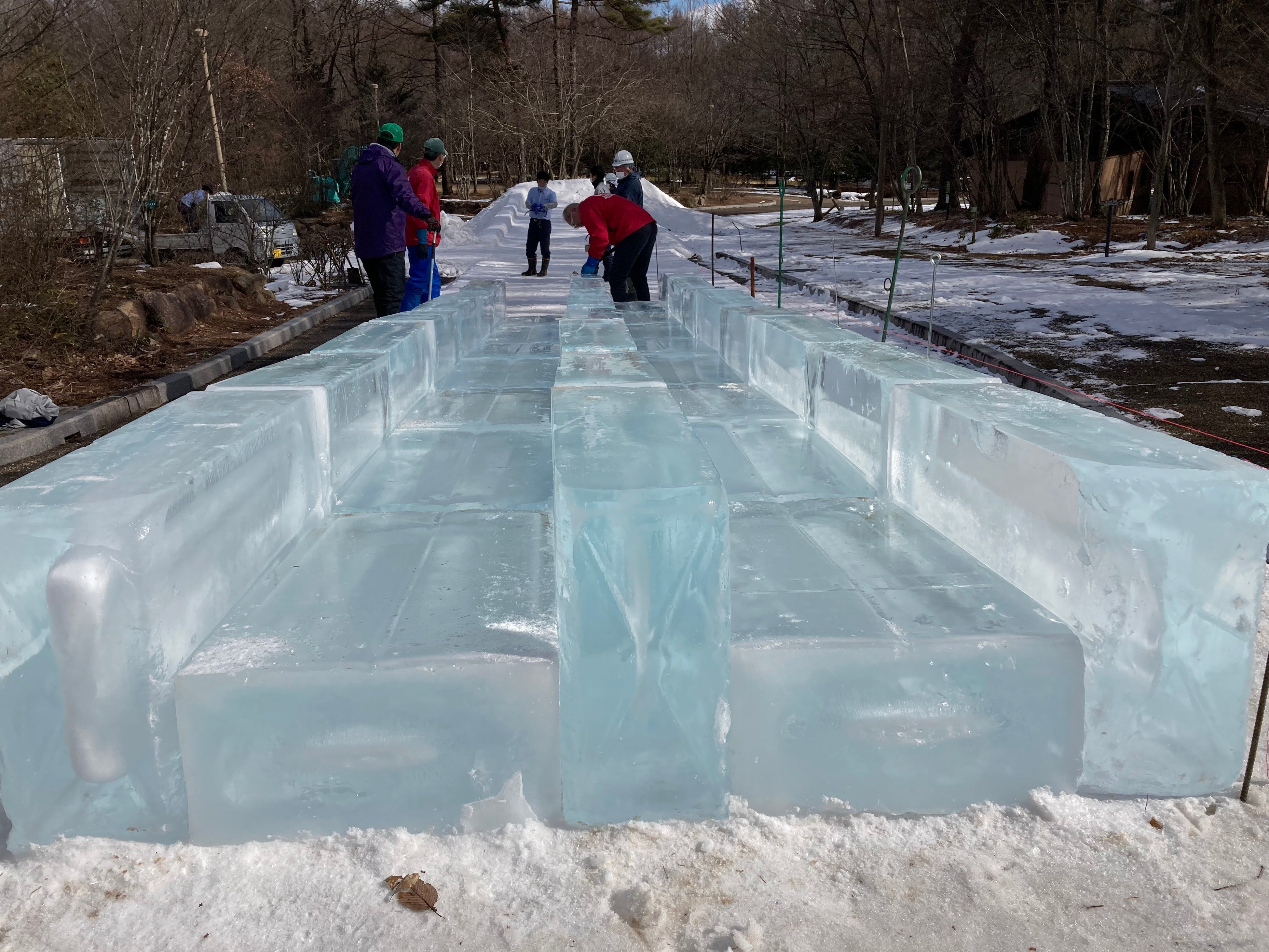 「アイススライダー」の製作作業は、2月6日(火)・7日(水)の2日間に予定しています。雪で作った基礎部分に、氷のブロック108個を並べ、2レーンの滑り台を作製します。