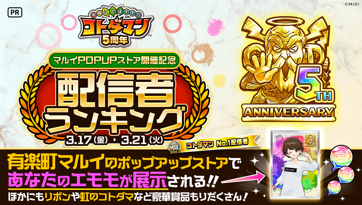 2023年4月14日(金)より、有楽町マルイのイベントスペースでポップアップストア「コトダマン5周年記念!ポップアップストア at 有楽町マルイ Presented by Mirrativ」を出店をいたします。期間は、2023年4月14日(金)~4月23日(日)の10日間です。