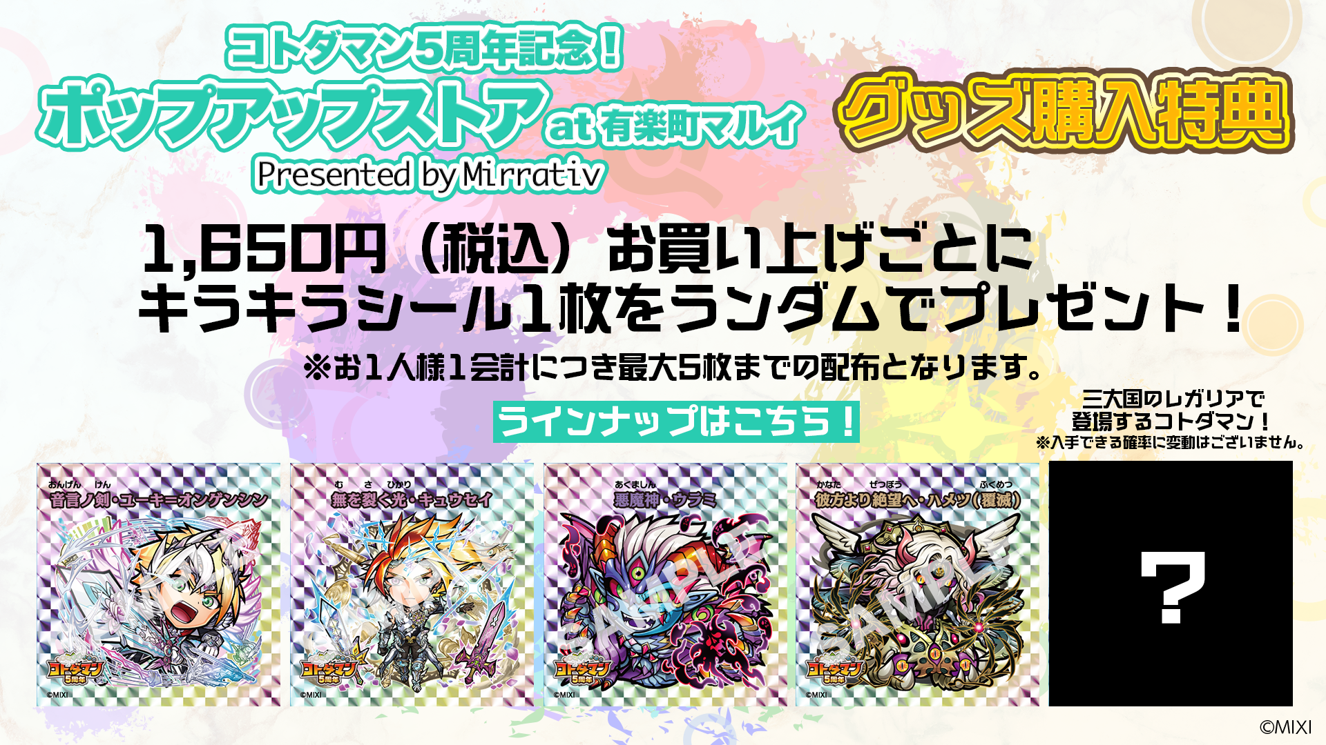 「コトダマン」初のポップアップストアでは、ミラティブと「コトダマン」が共同制作したコトダマン5周年記念グッズを販売します。また購入金額に応じて「キラキラシール(ポップアップストア)」(全5種)をランダムでプレゼントします。