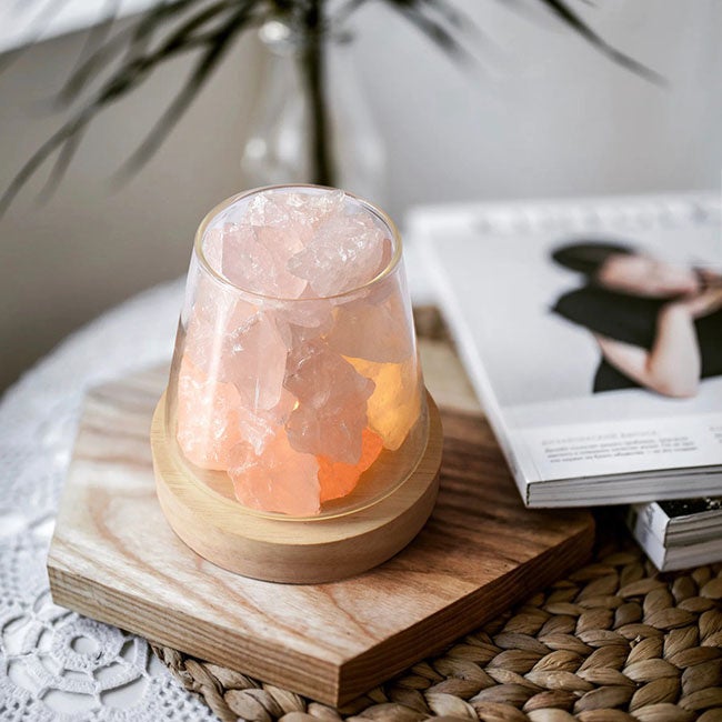 天然石にエッセンシャルオイルを垂らして使う、クリスタルディフューザーセット。ピンクのクリスタルには、心を癒し、対人関係をスムーズにしてくれる効果があるのだそう。お部屋に良い気を呼び込んでくれそうなアイテムです。