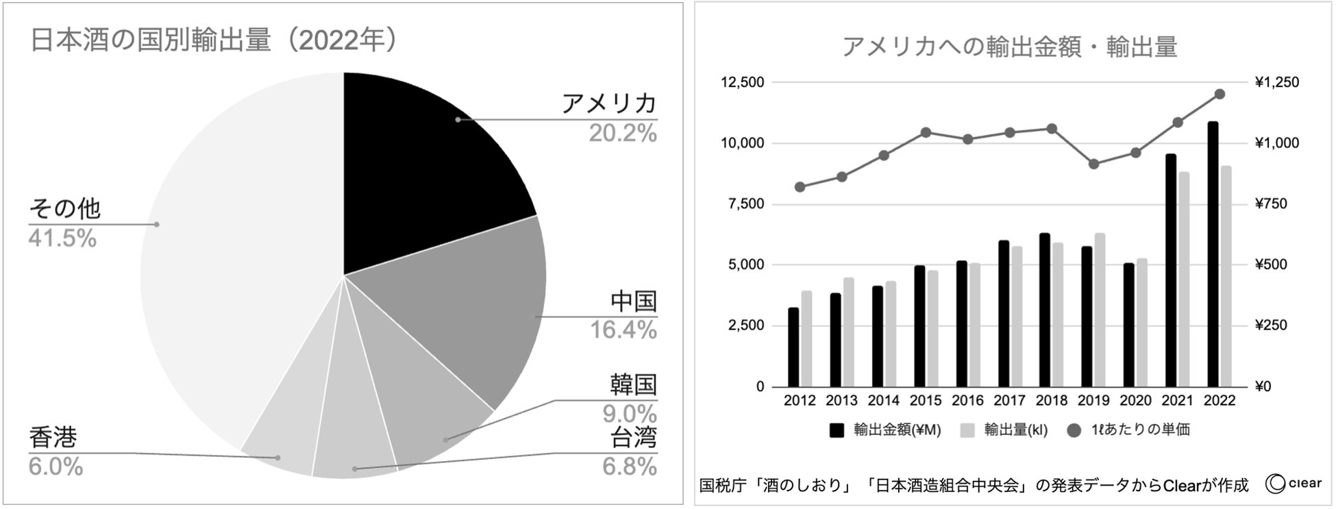 アメリカは日本酒の輸出量が世界第一位の国で、2022年の輸出量は10年前の2012年と比較して2.3倍、輸出金額は3.3倍、輸出単価も1.4倍と伸びを見せ、高価格化が進んでいます。
