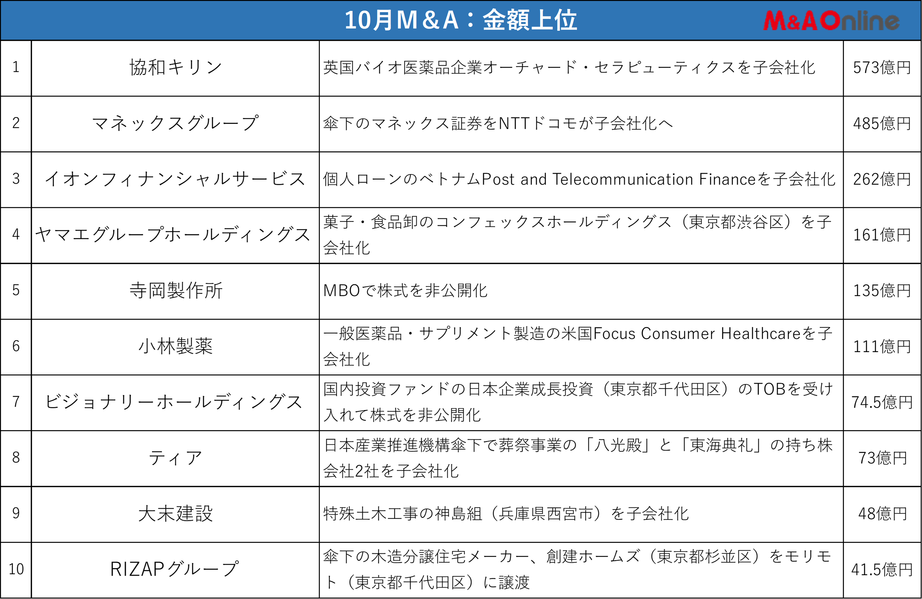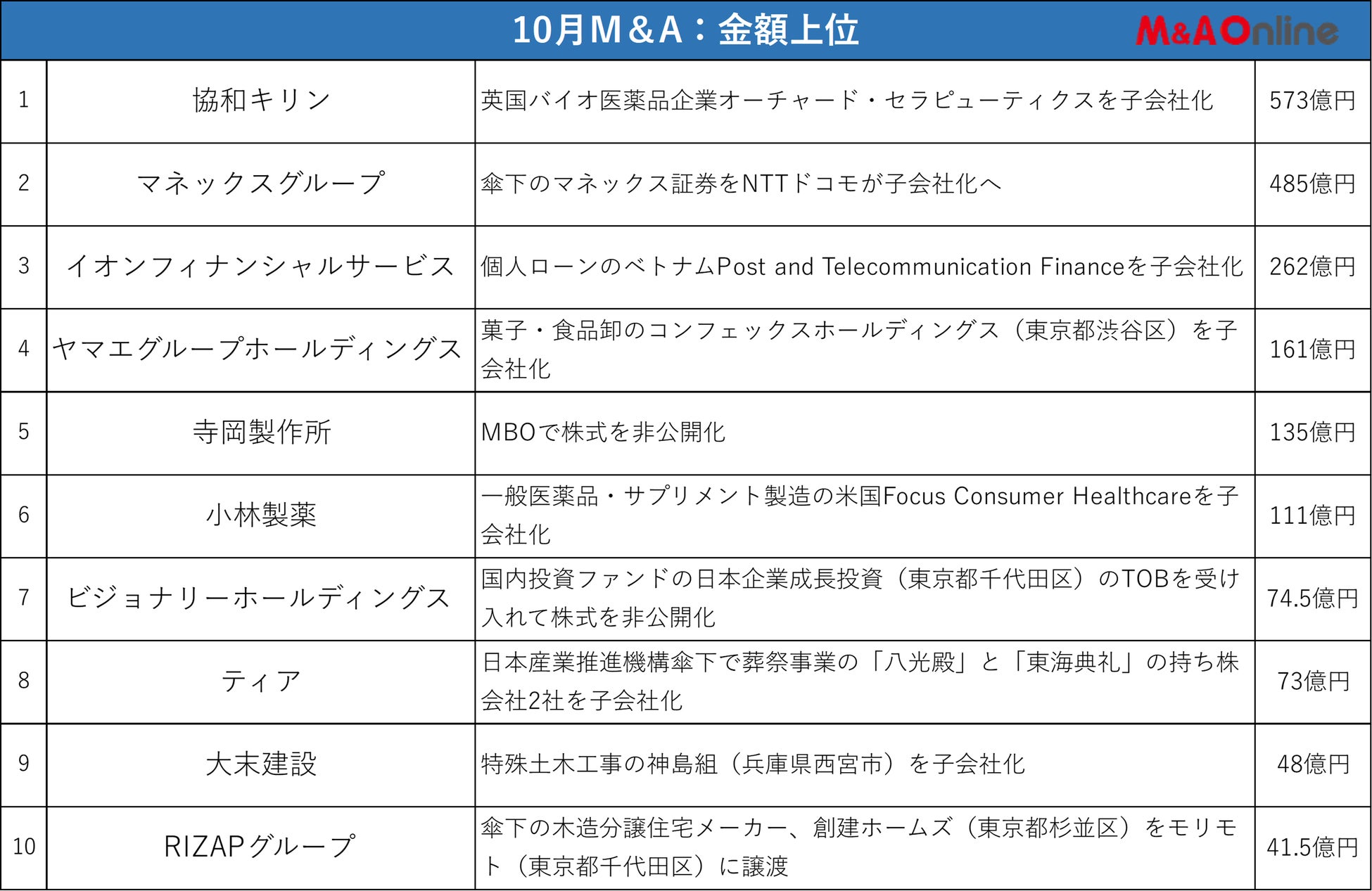 10月の金額首位は協和キリンが573億円を投じて英国のバイオ医薬品企業オーチャード・セラピューティクスを完全子会社化する案件。
