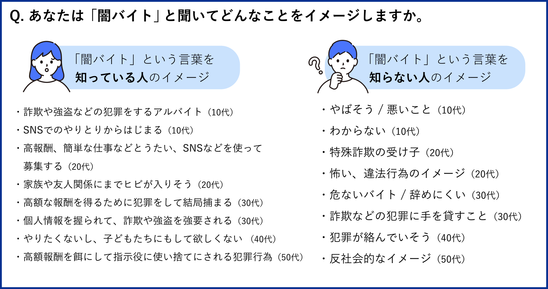 「闇バイト」という言葉を知っている人は、闇バイトについてより具体的な内容をイメージできている人が多い傾向がありました。「闇バイト」という言葉を知らない人も、闇バイトの危険性や犯罪であることを一定程度イメージしている人がいる一方で、中には明確なイメージを持っていない人もいました。