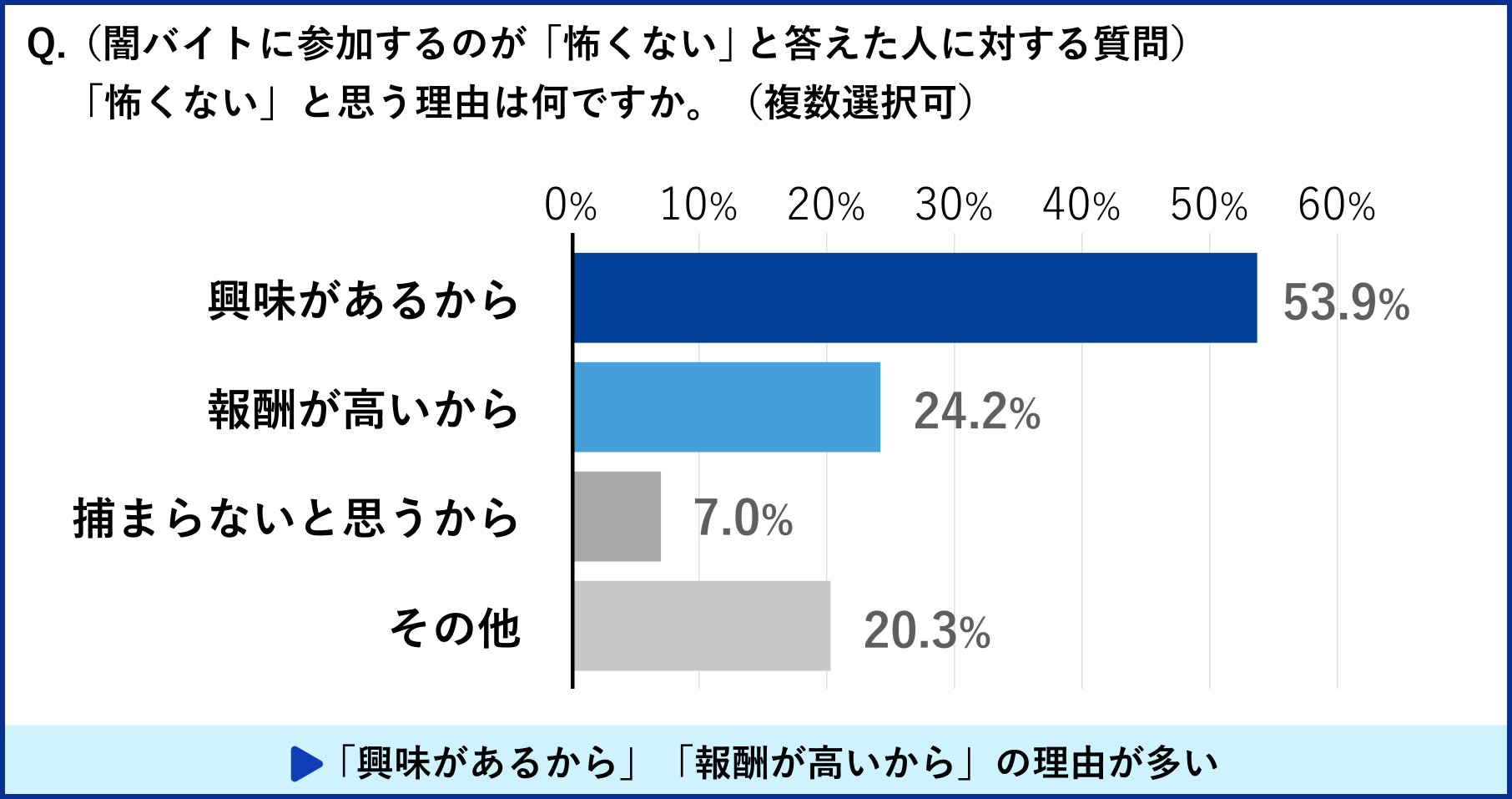 闇バイトに対して「怖くない」と思う理由について、最も多かったのは「興味があるから」、次いで「報酬が高いから」でした。