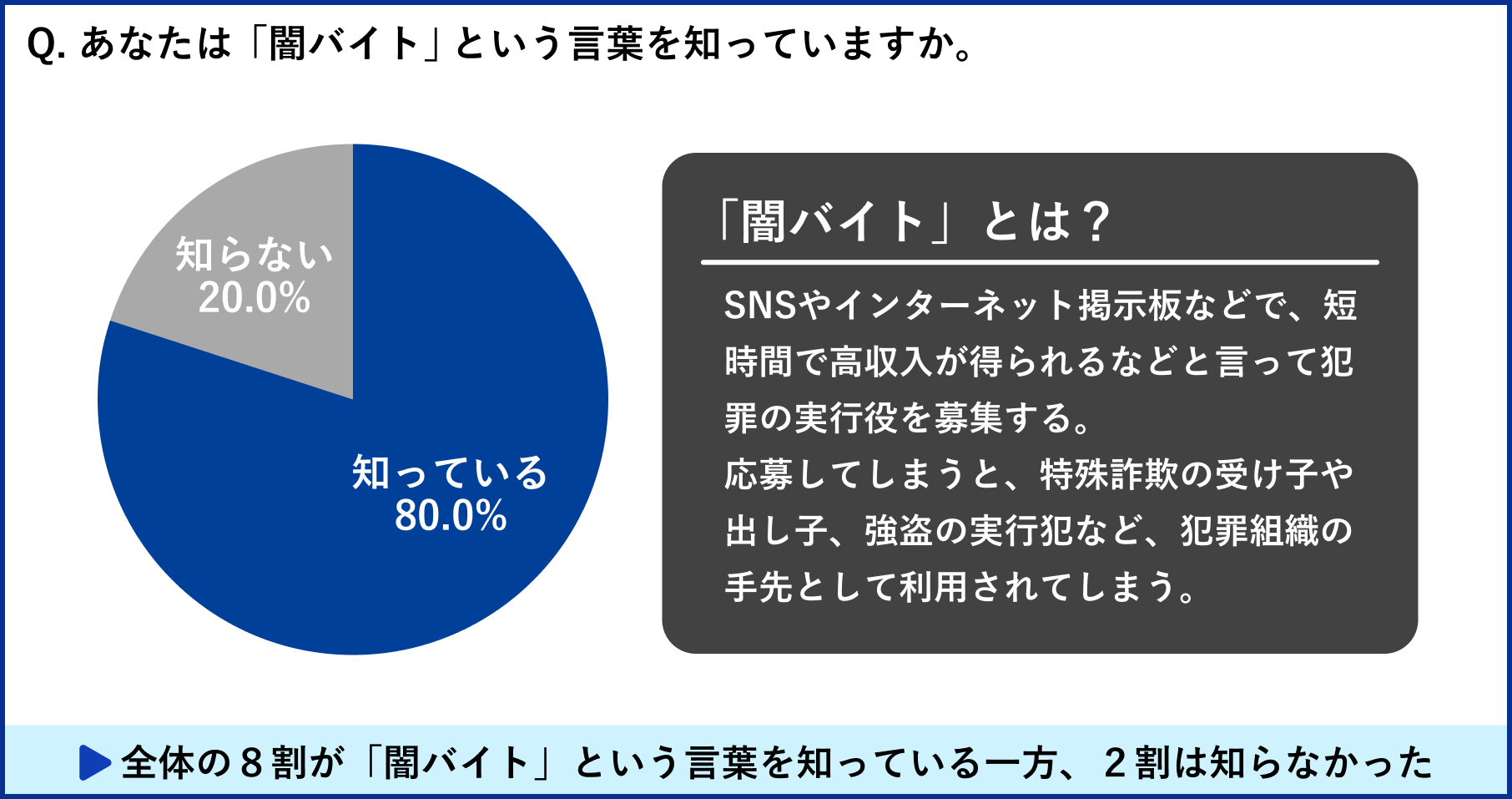 全体の8割が「闇バイト」という言葉を知っていると回答しました。一方で、2割は知らないと回答しました。