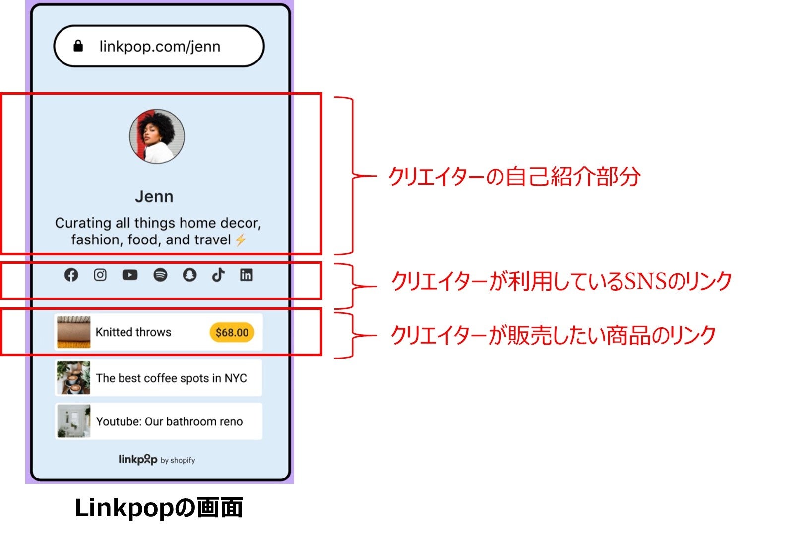 またLinkpopというリンクインバイオツールのサービスも提供しています。Linkpopは、ブランドやクリエイターが持つ様々なソーシャルメディアのプロフィールやその他の関連リンクを、1つのリンクにまとめることができるツールです。このツールにより、クリエイターはバイオリンクを完全なショッパブル(購入可能)体験にすることができます。クリエイターや個人は、自分の作品や活動を紹介しつつ、同じページで自分の作成した商品の販売が可能になります。Shopifyの高速で安全なチェックアウトを搭載しているので、Linkpop は、バイオリンクからチェックアウトの段階まで、お客様を速やかに誘導することができます。Linkpopは、複数のSNSを駆使して活動することが多いクリエイターが、SNSから簡単に商品を販売できるようにサポートする機能です。