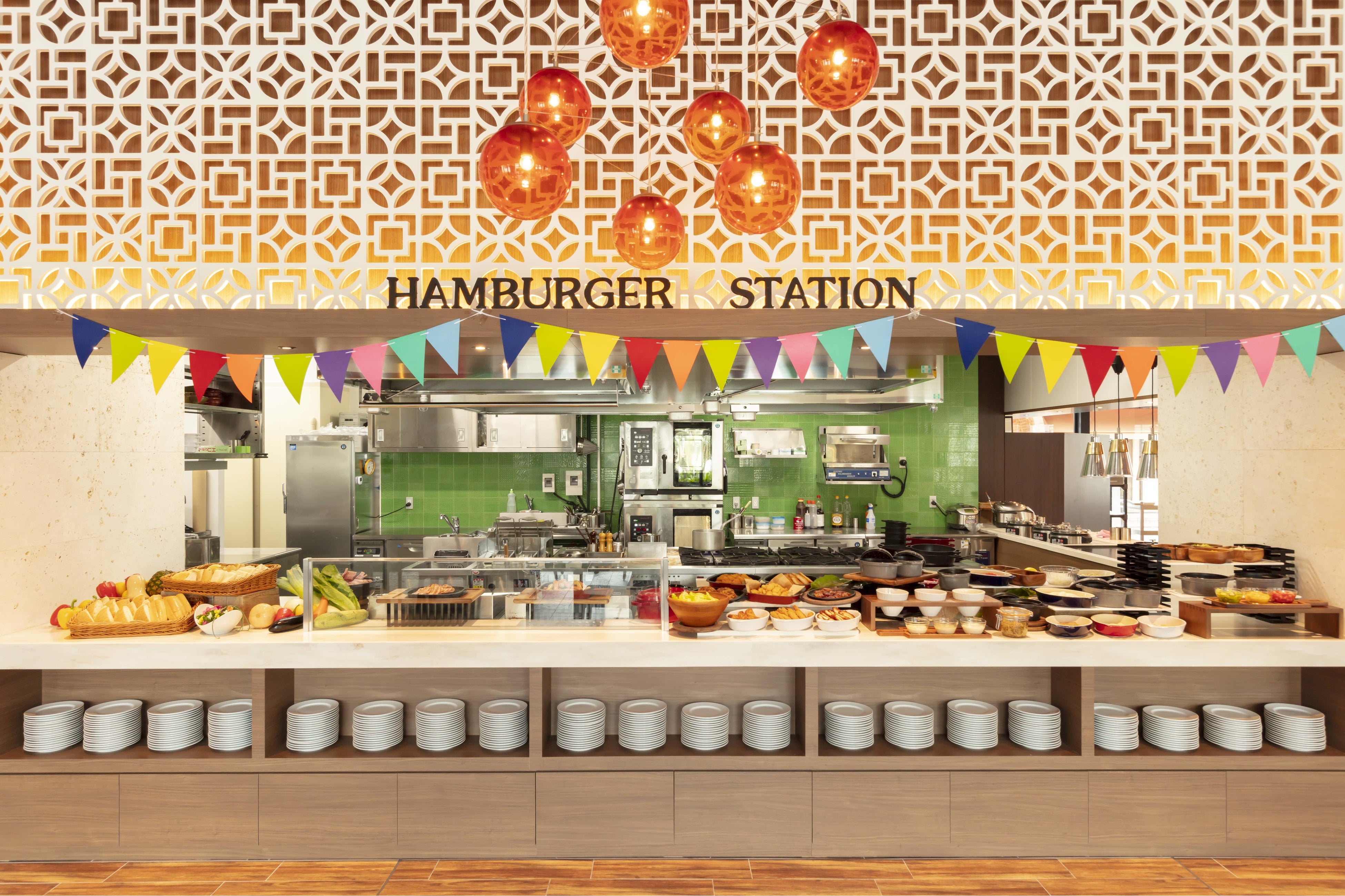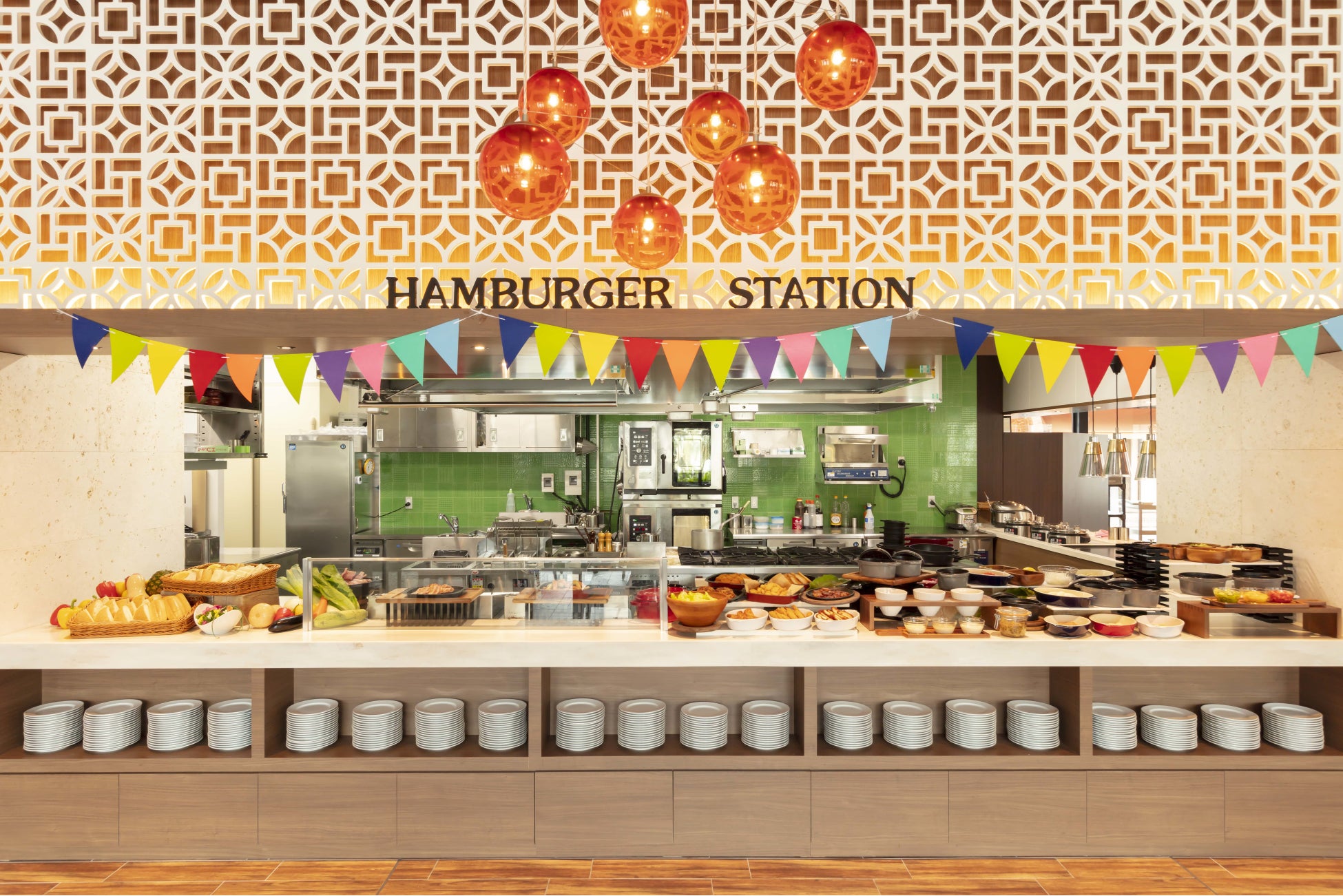 沖縄を感じるシグネチャー料理と約170種類の豊富な料理をオープンライブキッチンにてご提供。お好みのハンバーガーを作って楽しめるハンバーガーステーションが人気です。